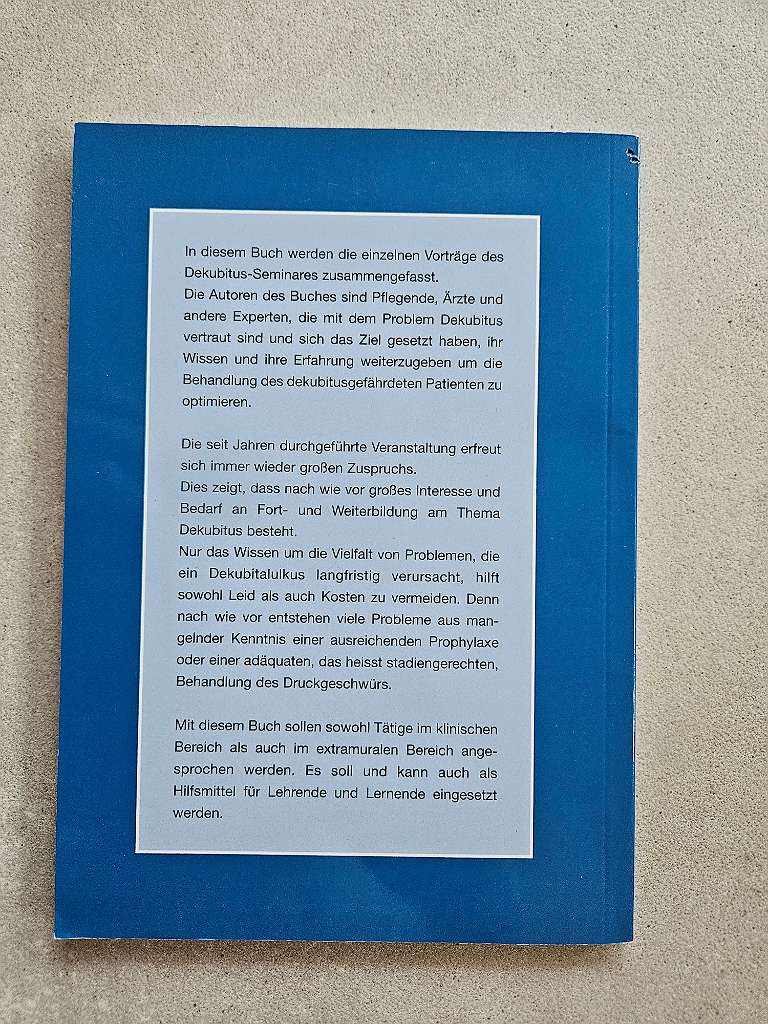 Dekubitus - Das Buch zum Seminar Herausgeber: Univ. Doz. Dr. Gerald Zöch Wien 2005 Text am Buchdeckel: In diesem Buch werden die einzelnen Vorträge des Dekubitus-Seminares zusammengefasst. Die Autoren des Buches sind Pflegende, Ärzte und andere Experten;...