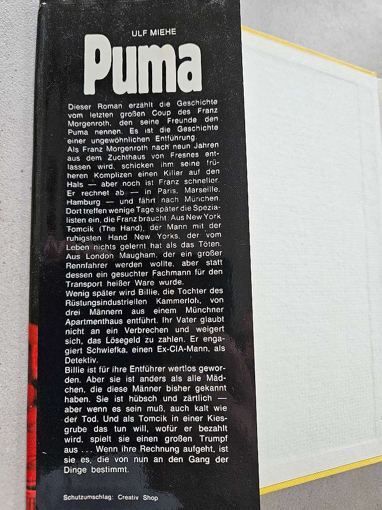Puma Autor: Ulf Miehe Genre: Roman Verlag: Piper 395 Seiten Drei Gangster, sechs Millionen und ein Mädchen - die Geschichte vom letzten großen Coup des Franz Morgenroth, den seine Freunde den Puma nennen. ISBN: 349202176X