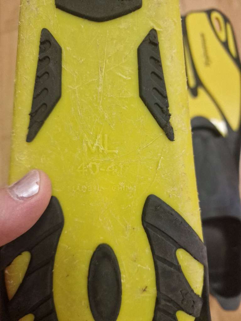 Die Flossen funktionieren Ansich noch, aber bei einem Fuß ist der Gummi vorne im Zehenbereich gerissen. Wurde geklebt, aber vermutlich müsste man hier noch nachbessern und mit sattlergarn nähen, oder anderen Gummi drüber kleben, damit es wieder gut hält....