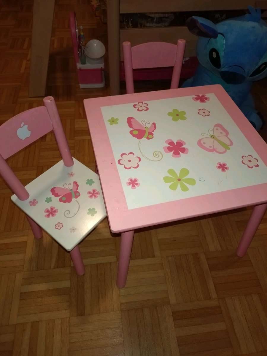 Verschenke Kindertisch + Stühle - wurden sehr gern genutzt und haben auch Gebrauchsspuren. Für kleinere Kinder geeignet.