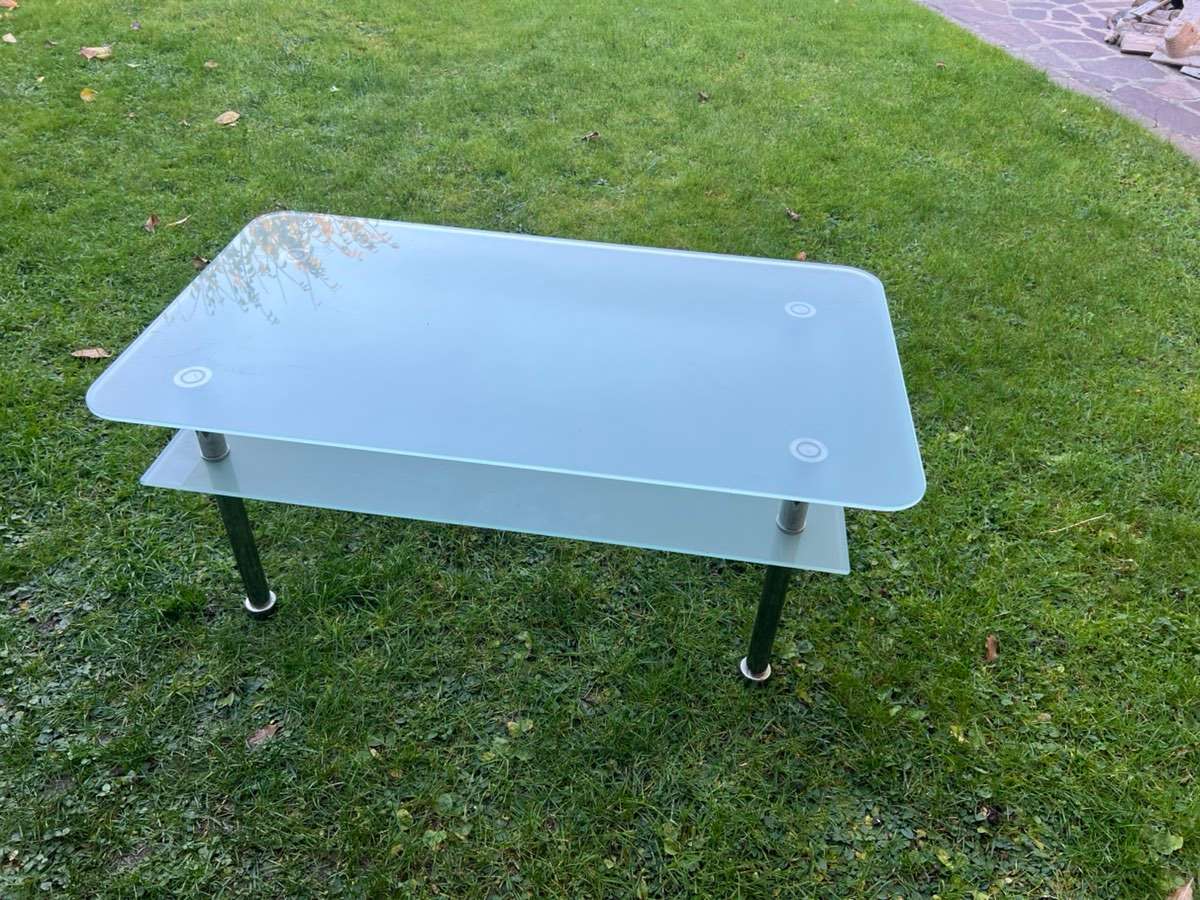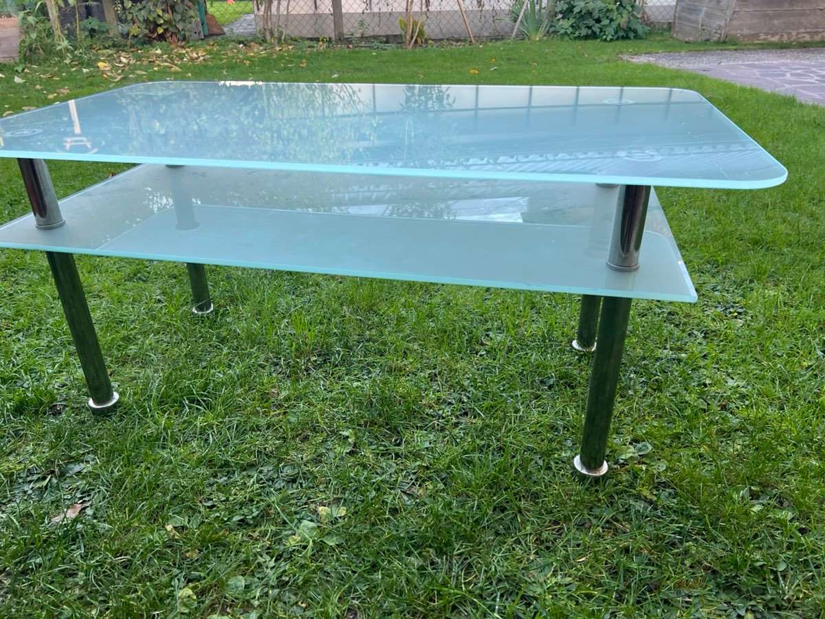 Verschenke Beistelltisch fürs Wohnzimmer mit zwei Glasplatten und Metallbeinen. Maße: 107 × 60 × 47 cm Guter Zustand, schlichtes Design. Privatverkauf – keine Garantie oder Rücknahme.