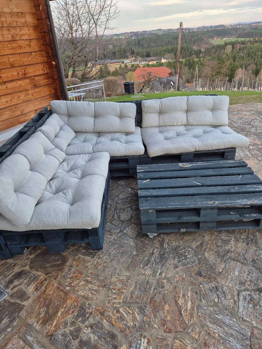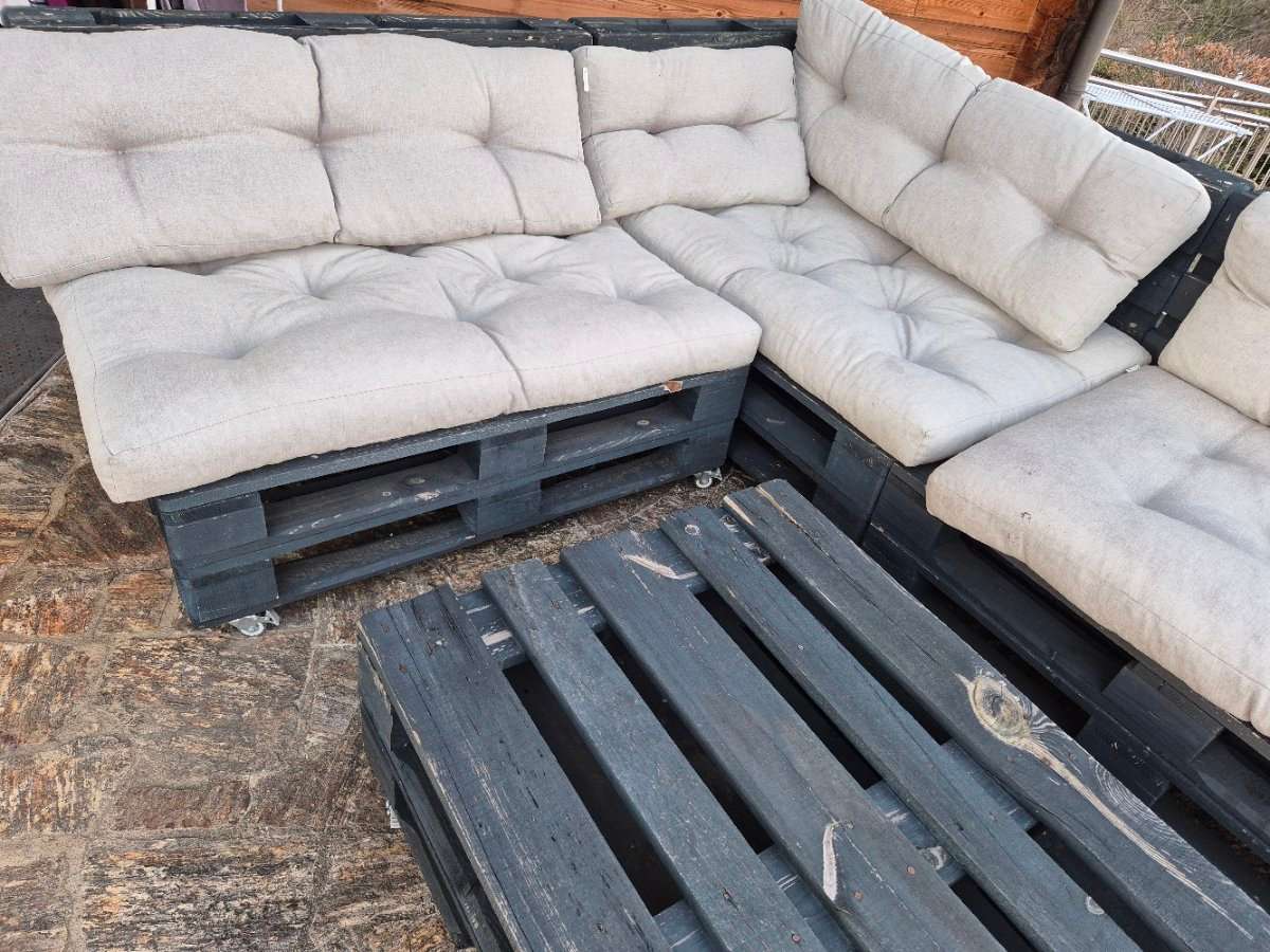 Palettenmöbel 4 teilig inkl. Sitzauflagen; Möbel sind auf Rollen; die Aufleger haben teilweise Harzflecken. Selbstabholung
