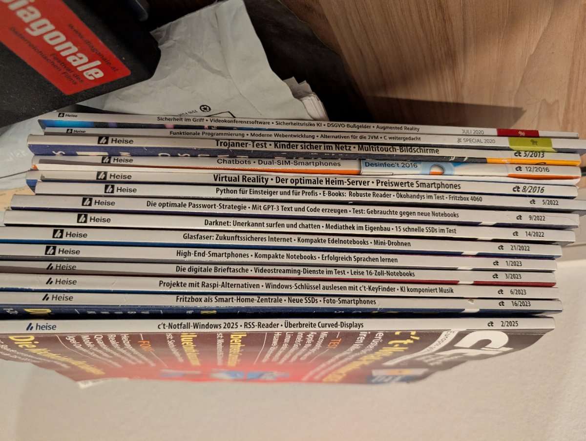 Verschenke ein Konvolut an c''t Magazinen wie am Foto abgebildet. Ausgenommen ist die unterste Ausgabe aus 2025. Abholung nähe Troststraße.