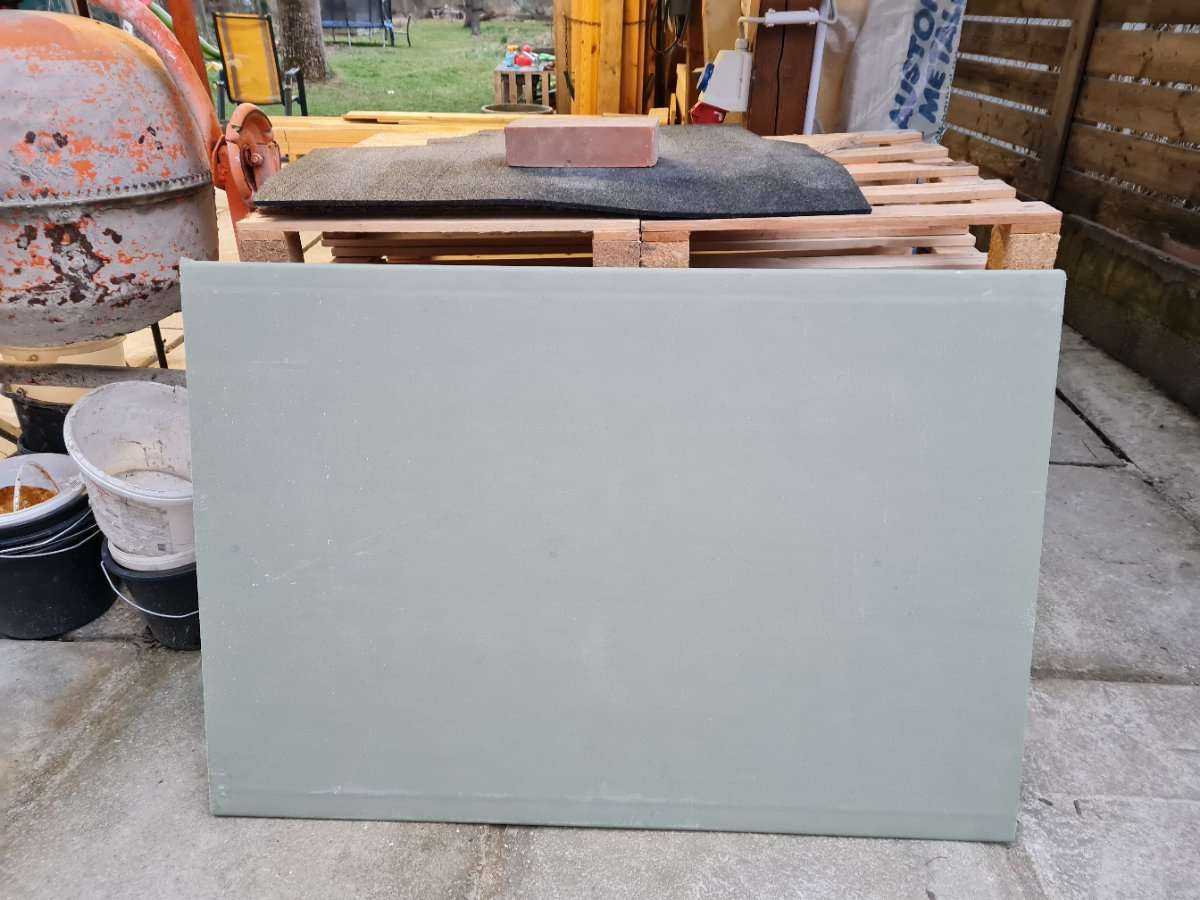 Verschenken diese Gipskartonplatte/Rigipslatte speziell für den Feuchtraum. Maße: 90cm mal 130cm, 12,5mm Stärke Dieser Rest ist uns übrig geblieben.