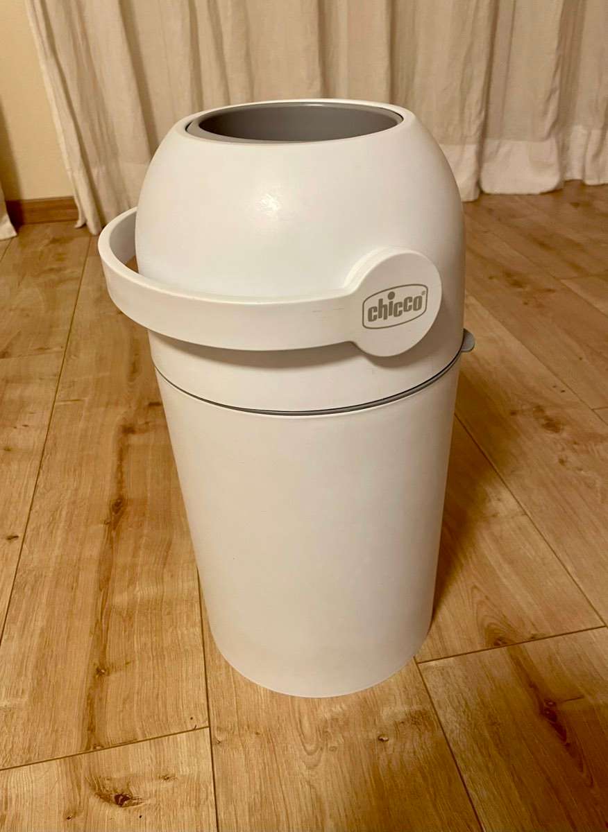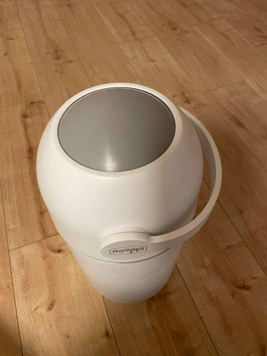 Frisch gereinigter, gebrauchter jedoch voll funktionsfähiger Windeleimer von Chicco. Mit normalen Müllsäcken verwendbar, geruchneutral verschließbar.