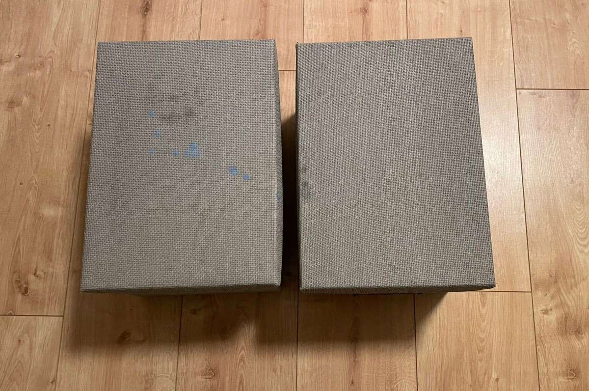 Zwei identische graue Kisten mit Deckel. Eine hat blaue Farbflecken. Ansonsten absolut funktionsfähig. L 35cm, B 24,5, H 20cm