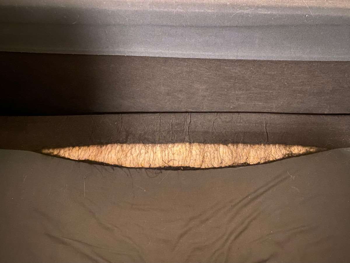 Kleine Couch zum aufmachen, wenn man drauf schlafen möchte! Kleiner Mängel: der Stoff ist etwas zerrissen, aber mit Decke noch wunderbar zu verwenden :)