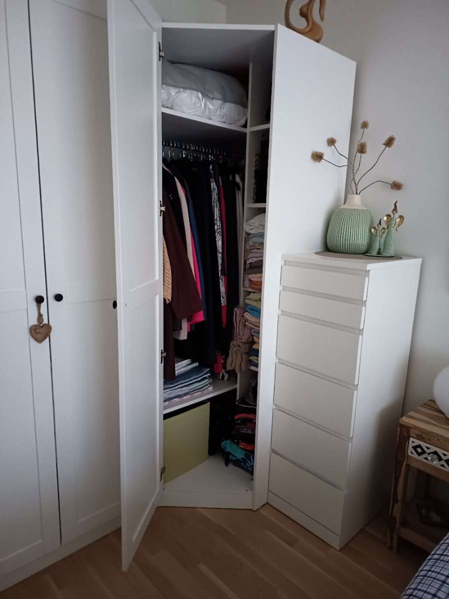 Kleiderschrank Ecklösung in der Farbe Weiß ohne Kastentüre zu verschenken. Regalböden und Kleiderstange inklusive! Maße: 91x91x210 Kastentüre kann im Möbelhaus noch zugekauft werden. Abholung ist erst Ende März möglich!!