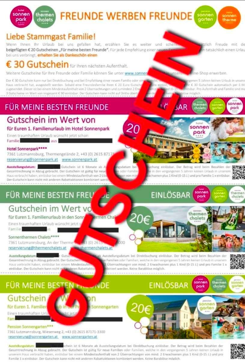 Verschenke einen 20 EUR Gutschein für euren nächsten Aufenthalt im Hotel Sonnenpark in Lutzmannsburg. Der Gutschein muss einfach beim Check-in an der Rezeption vorgelegt werden und der Betrag wird beim Bezahlen der Gesamtrechnung in Abzug gebracht. Der...