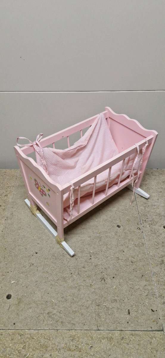Puppenwiege zu verschenken! Auf einer Seite gebrochen, siehe Bild wo es geklebt ist. Jedoch noch voll funktionsfähig, evtl. für den Garten.
