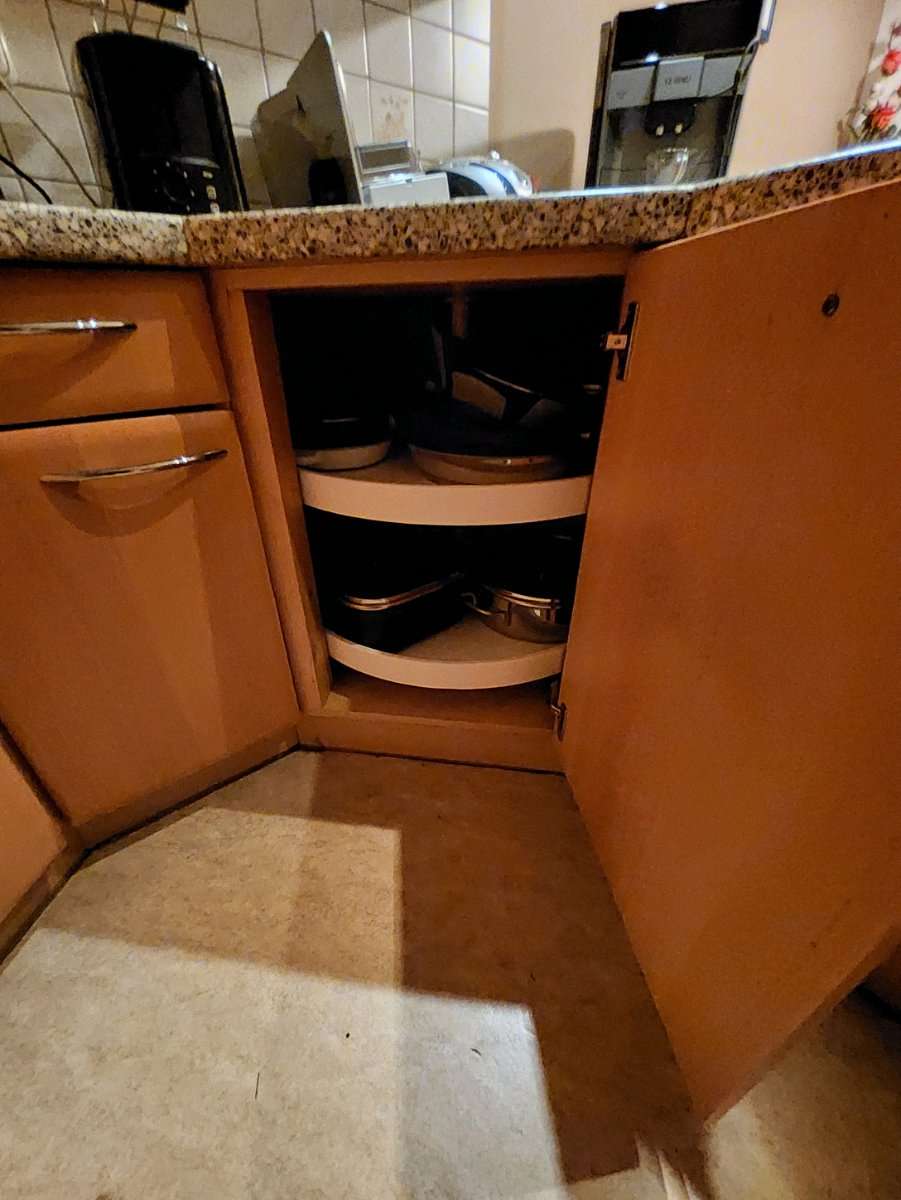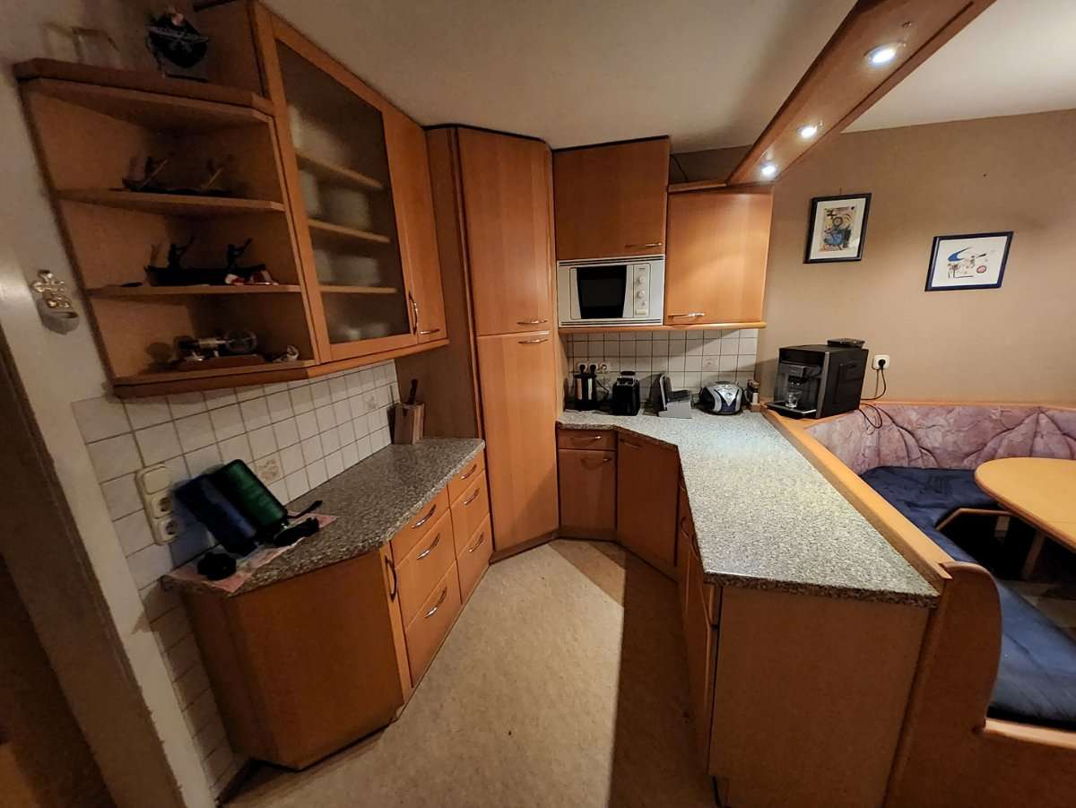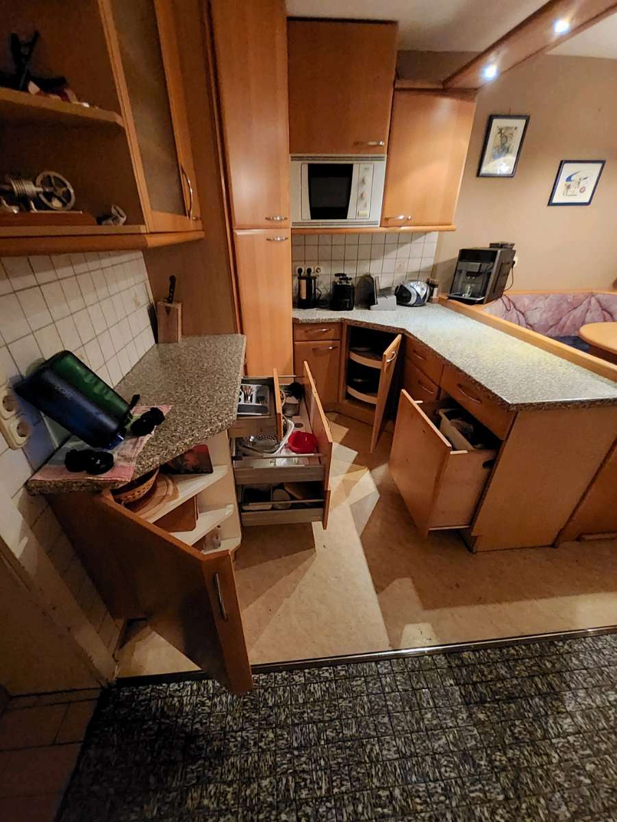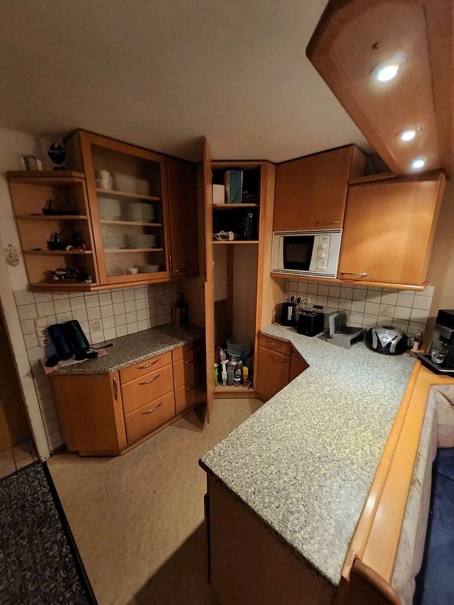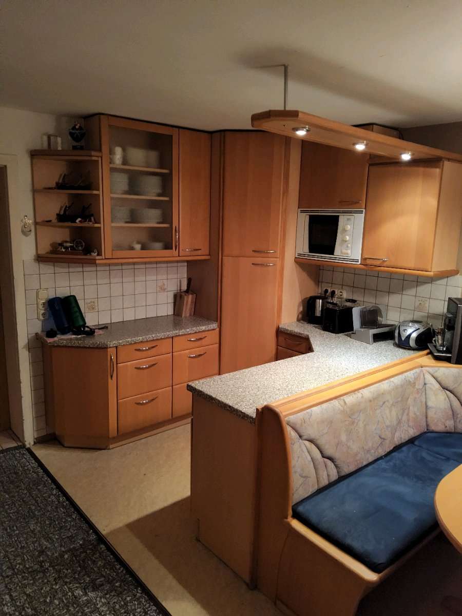 Küche im ganzen Abzugeben Abmessungen: Länge an der Wand: 200cm Länge an der Bank: 183cm Breite: 196cm Im Eck ist ein Rondell eingebaut Im anderen Eck ist ein großes Regal, welches als Besenkammer genutzt wurde (Staubsauger, Besen, Bügelbrett) Bei einer...