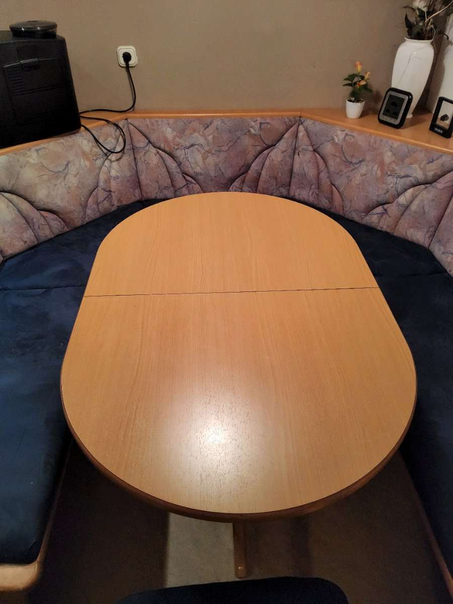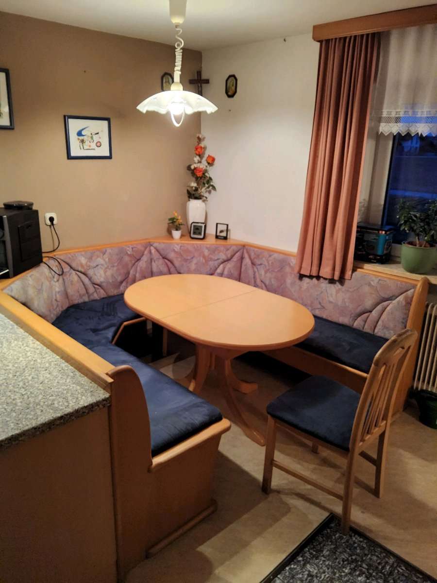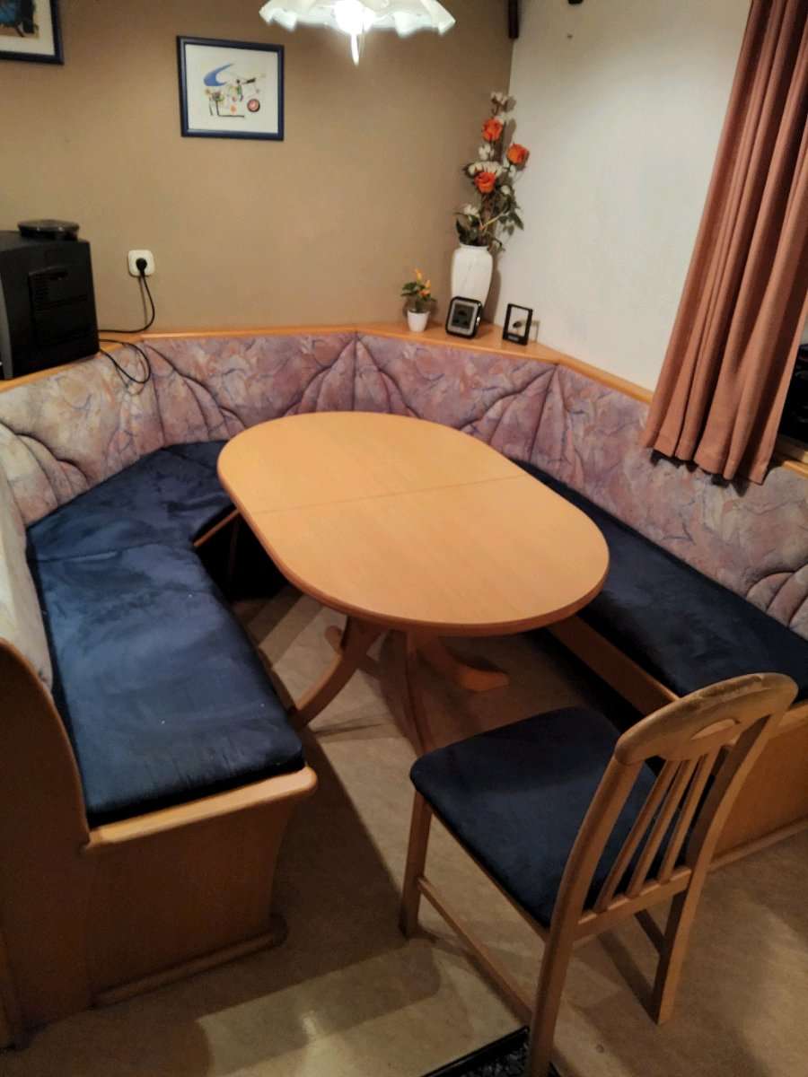 Essgruppe in U-Form Abmessungen: Bank am Fenster: 202cm Bank an der Küche: 182cm Abstand Bänke außen zueinander 203cm Tisch: 120cm x 80cm Der Tisch kann um 50cm ausgezogen werden Unter den Bänken sind Staufächer