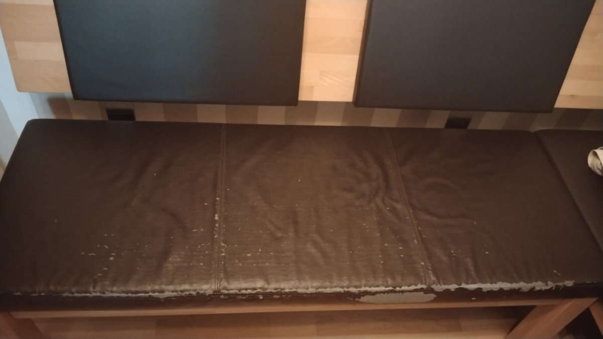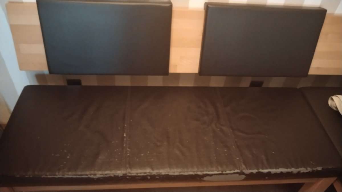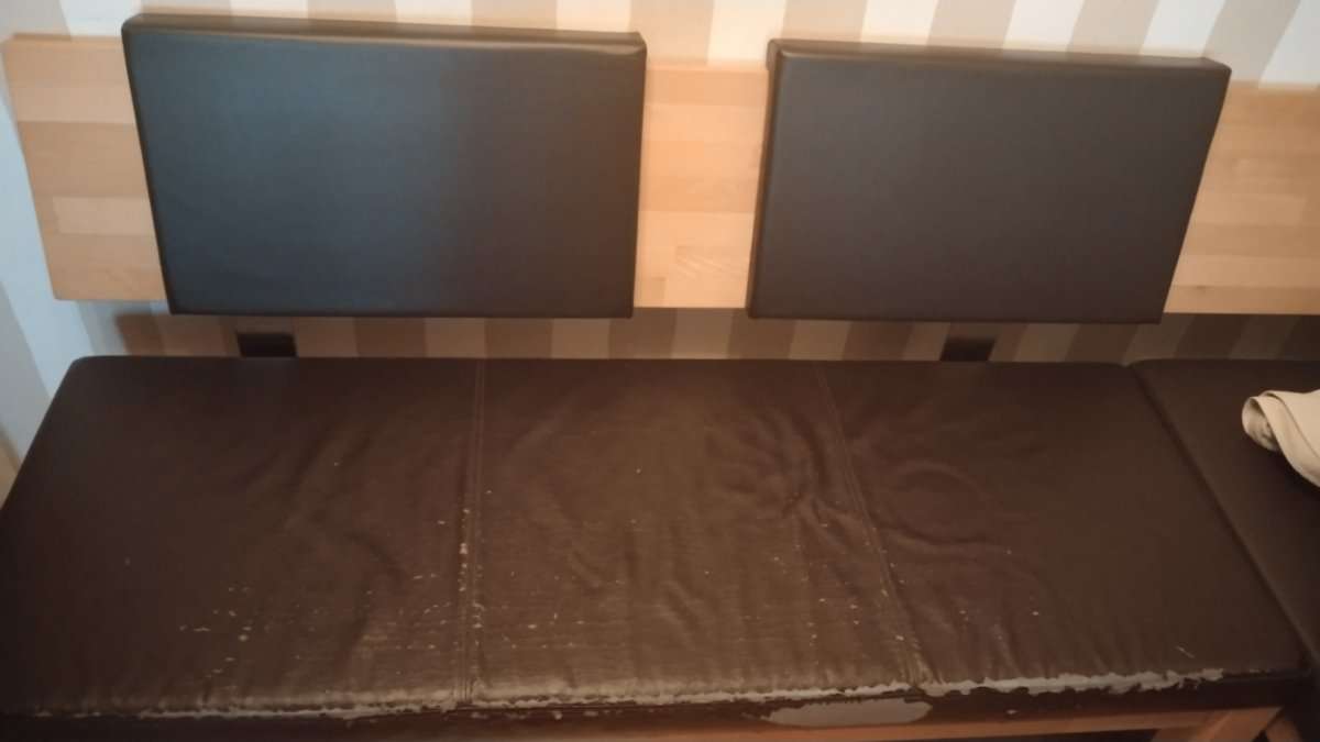 Verschenke Bank mit Lehne Maße Sitzfläche ca.140cm / Holzlehne ca 189cm. Die Sitzbank ist sehr abgenützt - siehe Fotos. Aber wenn man geschickt ist, kann man diese neu überziehen.