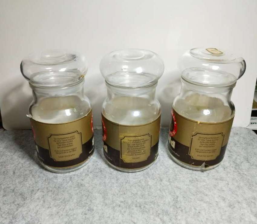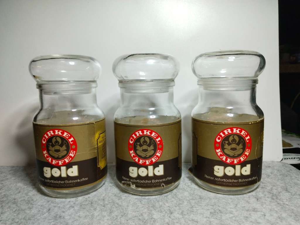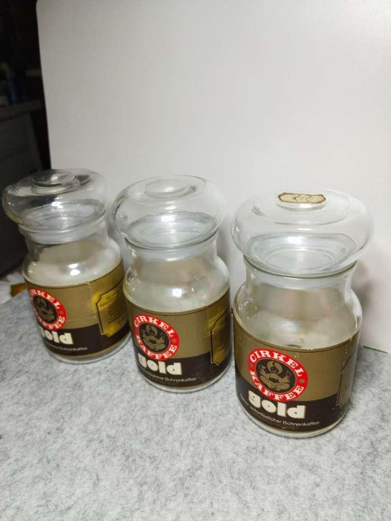 Vintage, Retro, Kaffee, Cirkel, Glas, Bohnenkaffee, Deko, Vorratsglas, Sammlerstück, BRD, leer, 100g, 70er, 80er, Westdeutschland 3 originale, leere Vintage-Gläser der Marke Cirkel Kaffee – Gold (ehemals Instant-Kaffee, 100g Inhalt). Die Gläser stammen...