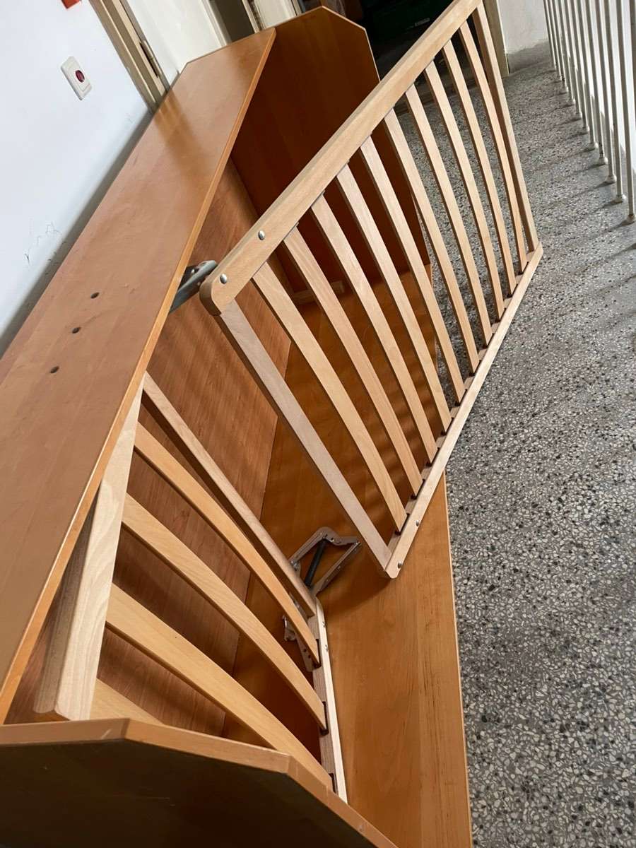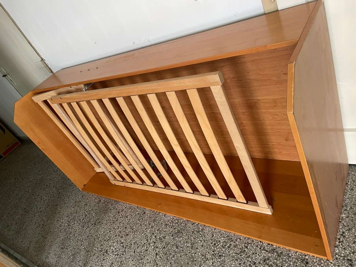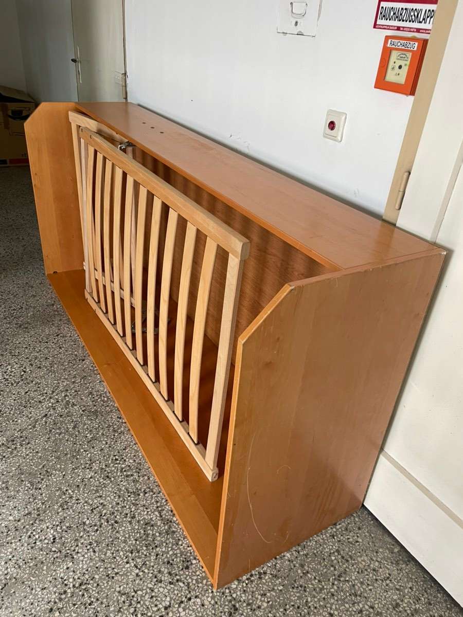 Einzelbett mit Lattenrost, Kopfteil verstellbar und Bettzeugkasten, Farbe Kirsch, funiert