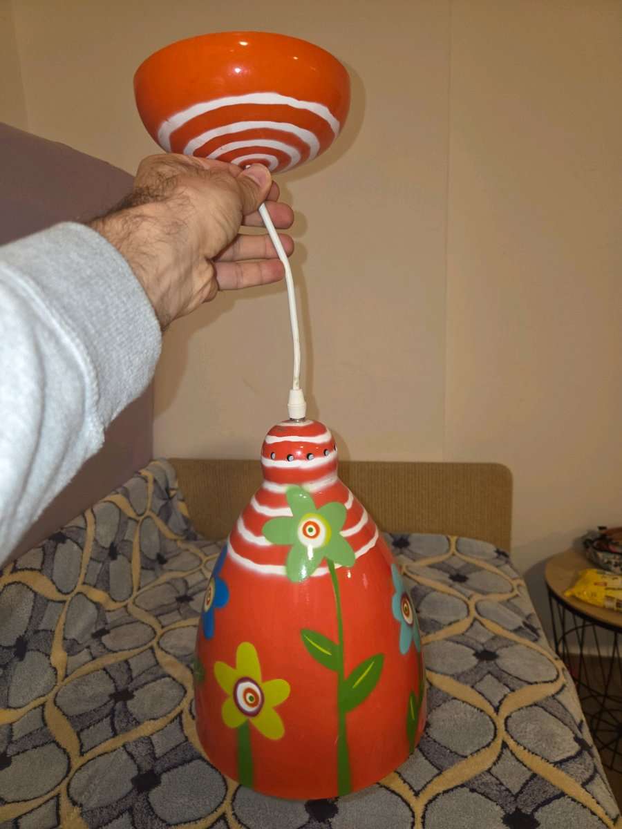 Ich verschenke diese fröhliche, orangefarbene Hängelampe / Deckenlampe mit bunten Blumen-Motiven. Sie ist gebraucht, aber in einem sehr guten Zustand (siehe Fotos) und eignet sich perfekt für ein Kinderzimmer. Die Lampe hat eine Standard-Fassung...