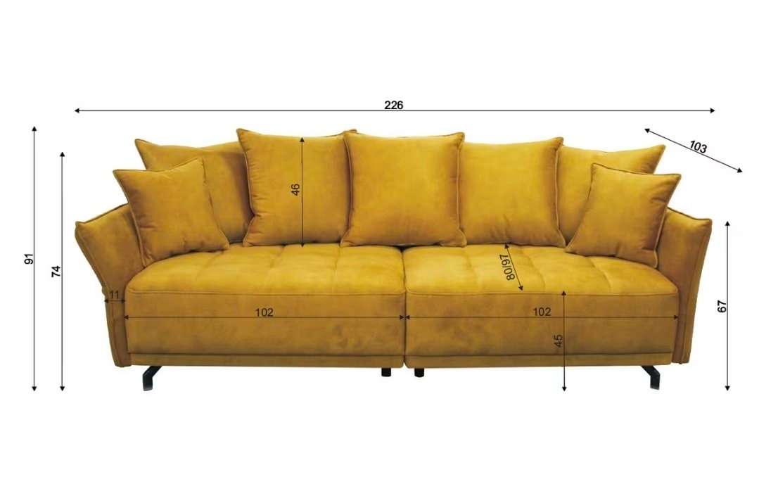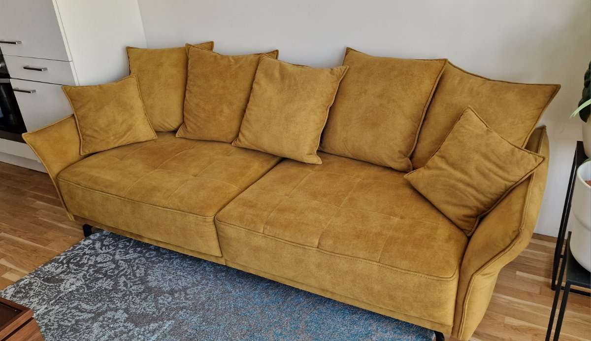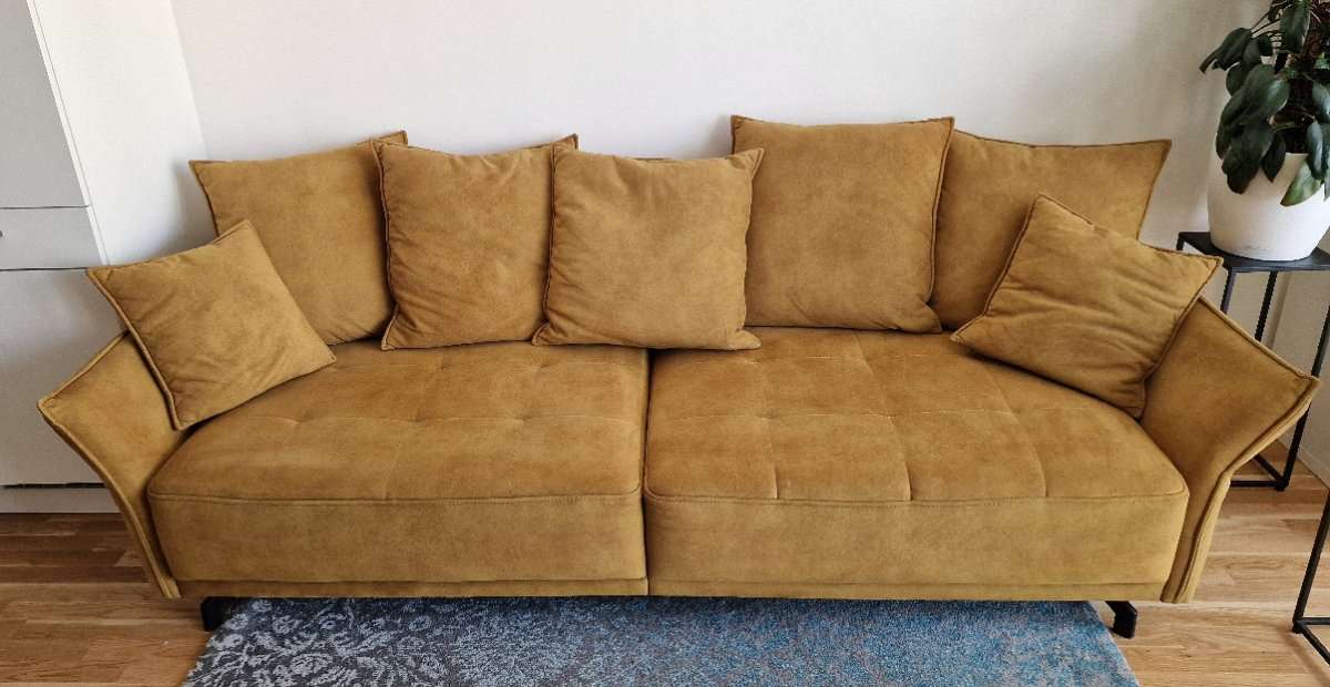 Big Sofa mit 5 grossen und 2 kleine Kissen. Kann für den Transport in 2 Teile geteilt werden. Maße siehe Bilder. Farbe laut Hersteller •gelb•