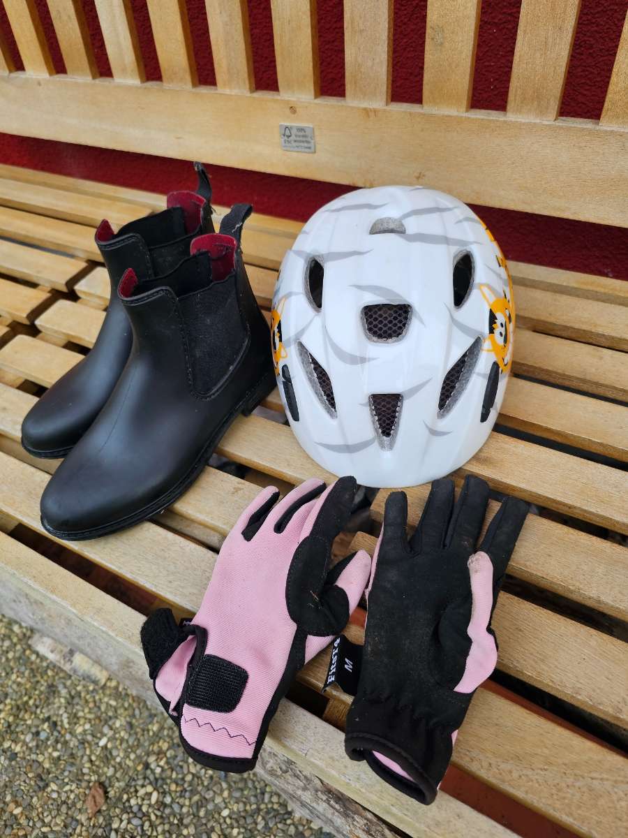 Reitschuhe, Handschuhe und Radhelm