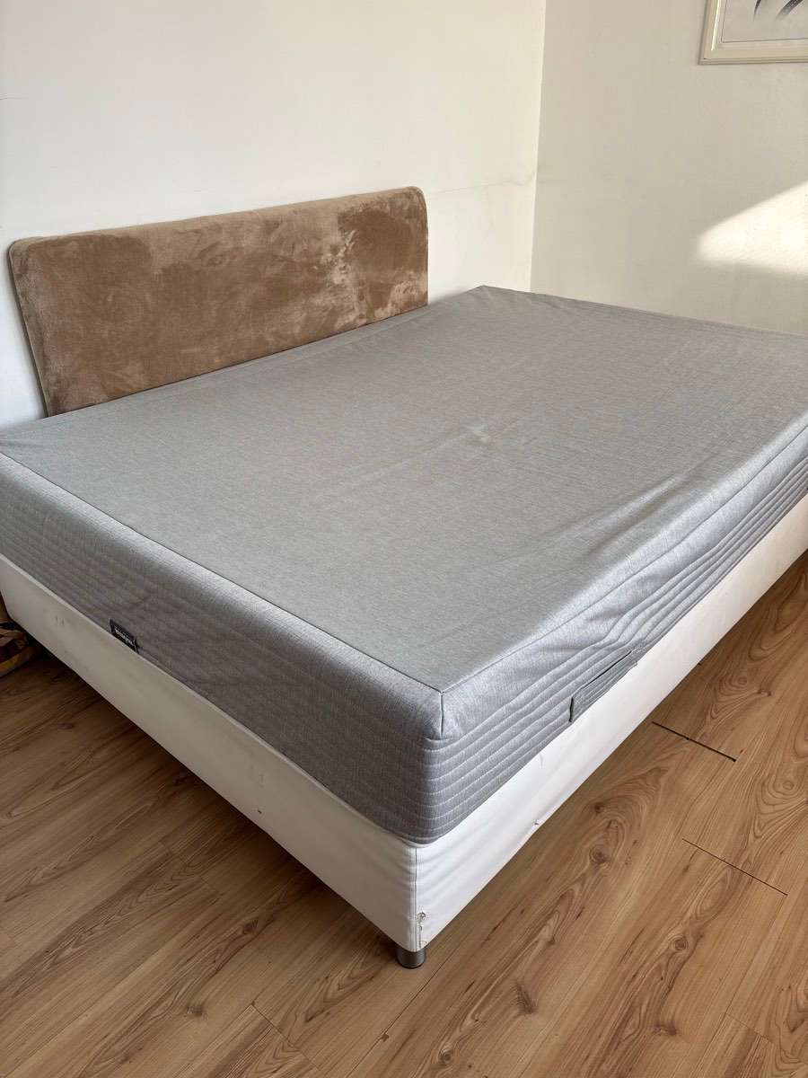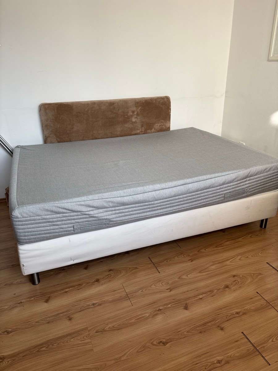 Bett inklusive Matratze zu verschenken! Maße: 140/200cm Weiß mit brauner selbst überzogener Rückwand Leichte Beschädigung am Korpus (Lederabnützung) Sonst in gutem Zustand.