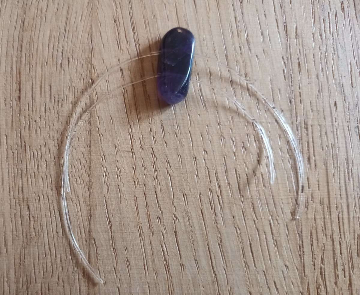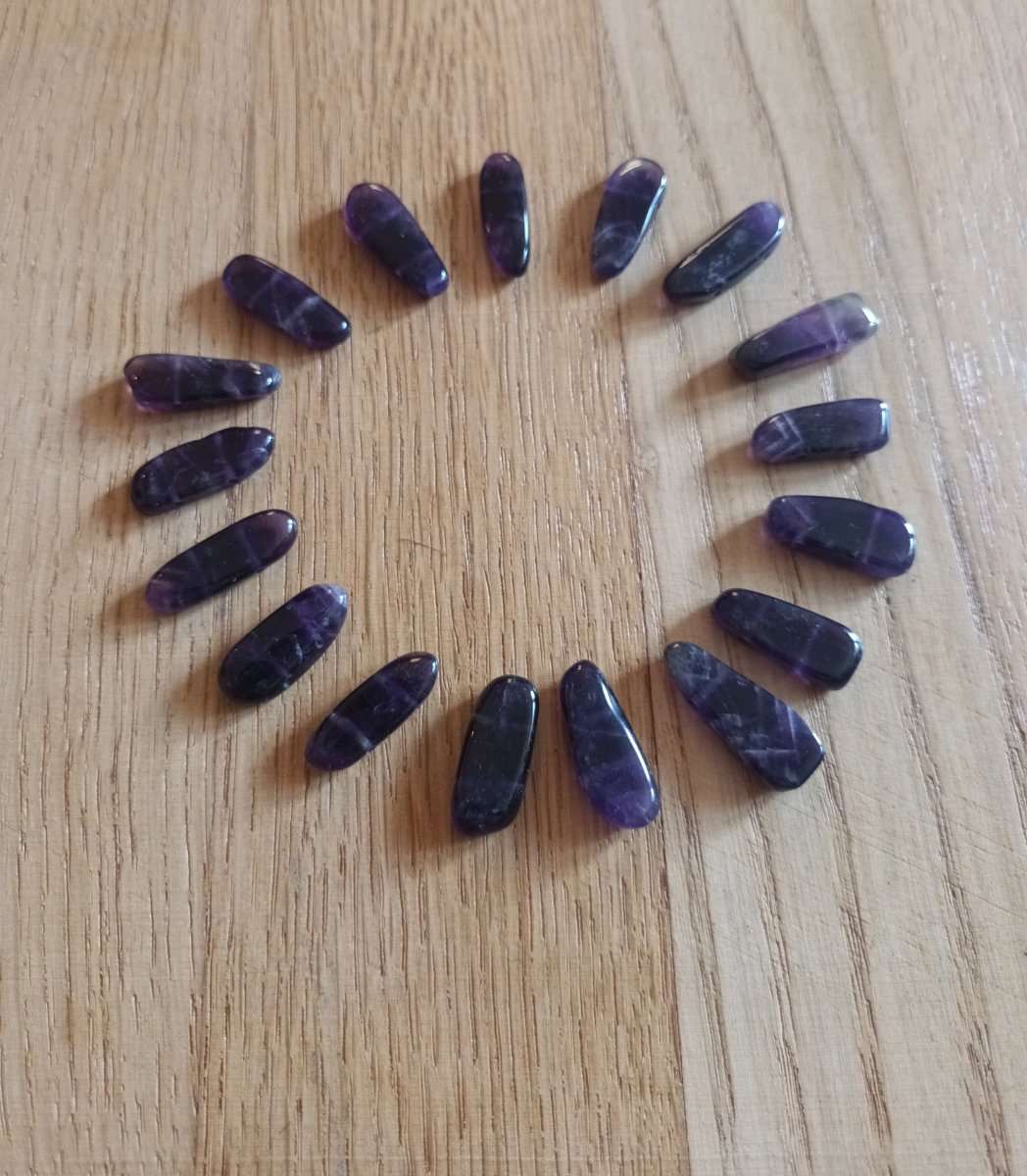 16 Amethyststücke für die Herstellung eines Armbandes oder mehrerer Armbänder. Jedes Stück ist mit zwei kleinen Löchern versehen.