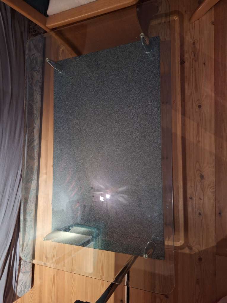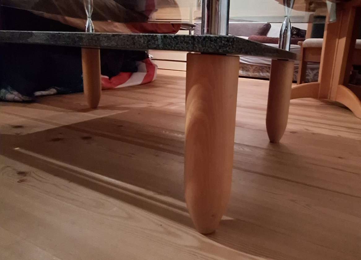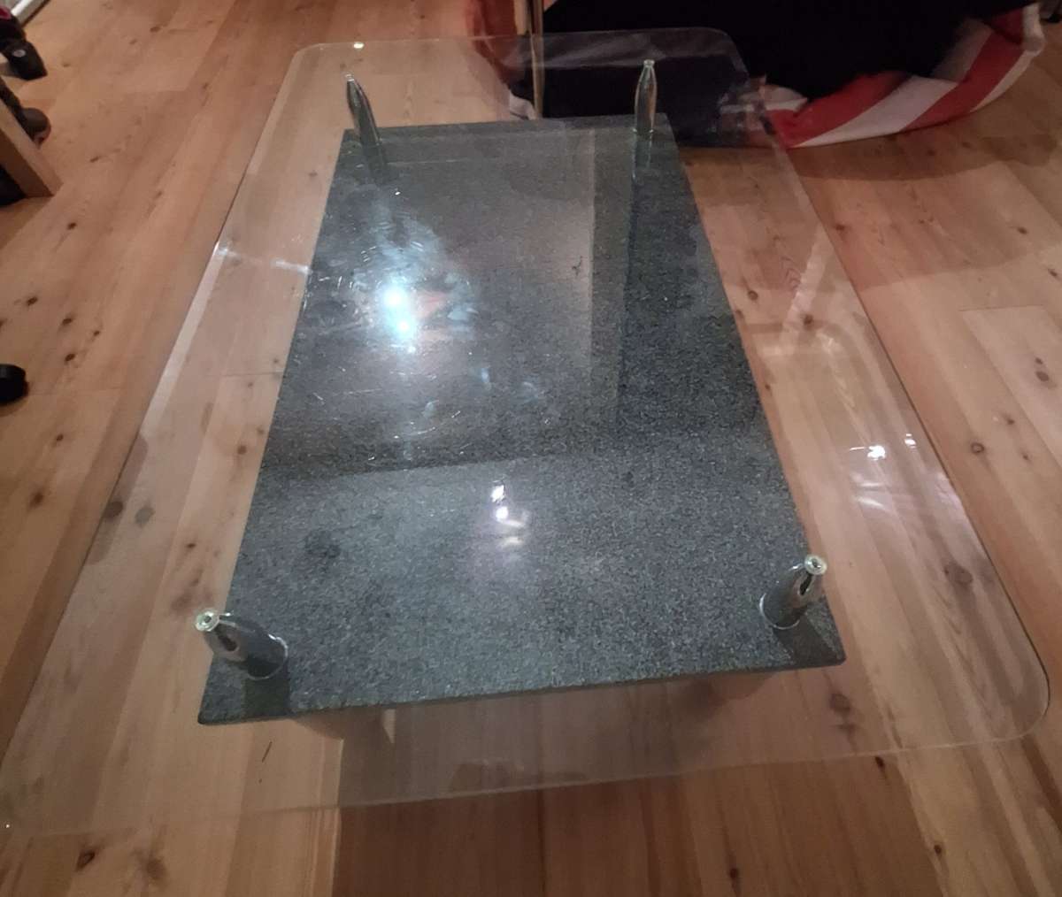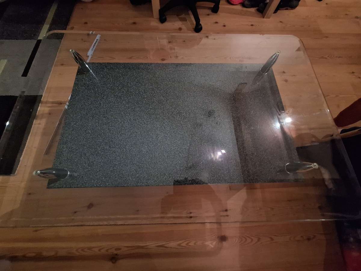 Glastisch für Couch mit Holzfüßen und grauer Zwischentischplatte Höhe 42,5cm Länge 116cm Breite 75,5 cm Glasplatte abnehmbar