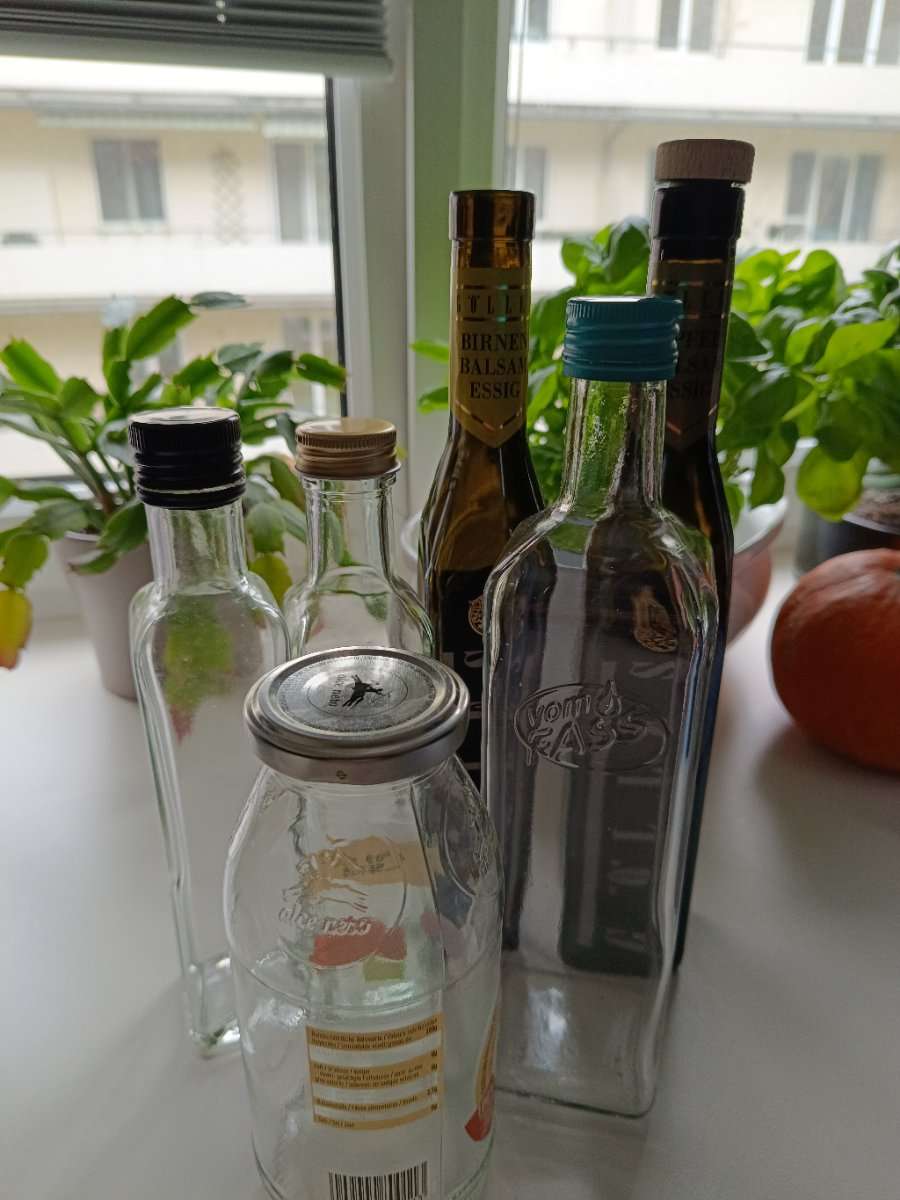 Verschiedene Glasflaschen für Essig zu verschenken.