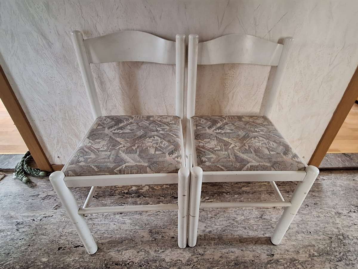 2 Stühle – Holz mit gepolsterter Sitzfläche (zu verschenken) Verschenke zwei stabile Holzstühle mit gepolsterter Sitzfläche. Die Stühle sind weiß lackiert und haben einen gemusterten Stoffbezug. Ideal für Küche, Esszimmer, Gästezimmer oder als...