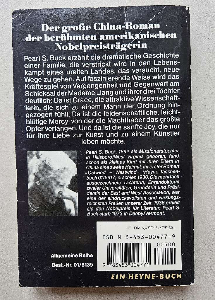 Die Töchter der Madame Liang Genre: Roman Autor: Pearl S. Buck Verlag: Heyne Text am Buchdeckel: "Der große China-Roman der berühmten amerikanischen Nobelpreisträgerin Pearl s. Buck erzählt die dramatische Geschichte einer Familie, die verstrickt wird in...