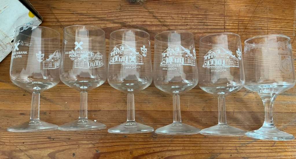 Verschenken 6 Stk. Weingläser - 5x Raiffeisenbank Pöchlarn - 1x Weingut Unfried Krustetten Versand übernimmt Empfänger