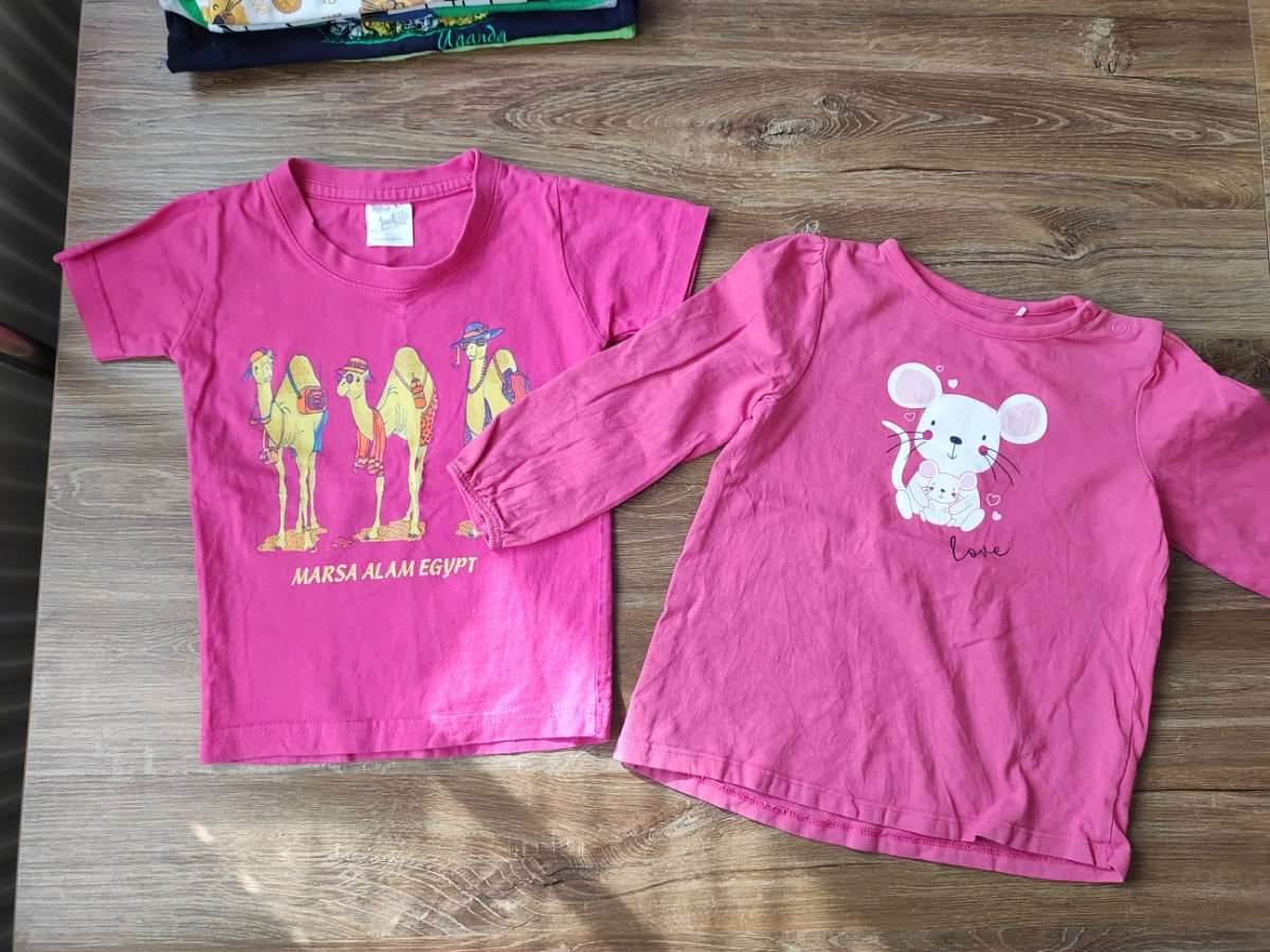Abzugeben ist ein T-Shirt und ein Langarm-Shirt. Nicht mehr die schönsten Sachen, aber für den Spielplatz gut genug.