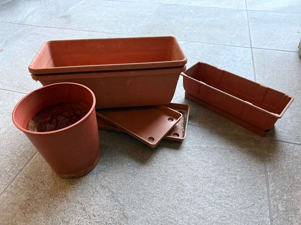 Verschenke versch. Pflanzgefäße, Töpfe Untersetzer siehe Fotos 1x rechteckig klein m. Untersetzer 31x11x11cm 2x rechteckig m. Untersetzer 40x18x14 1 Topf