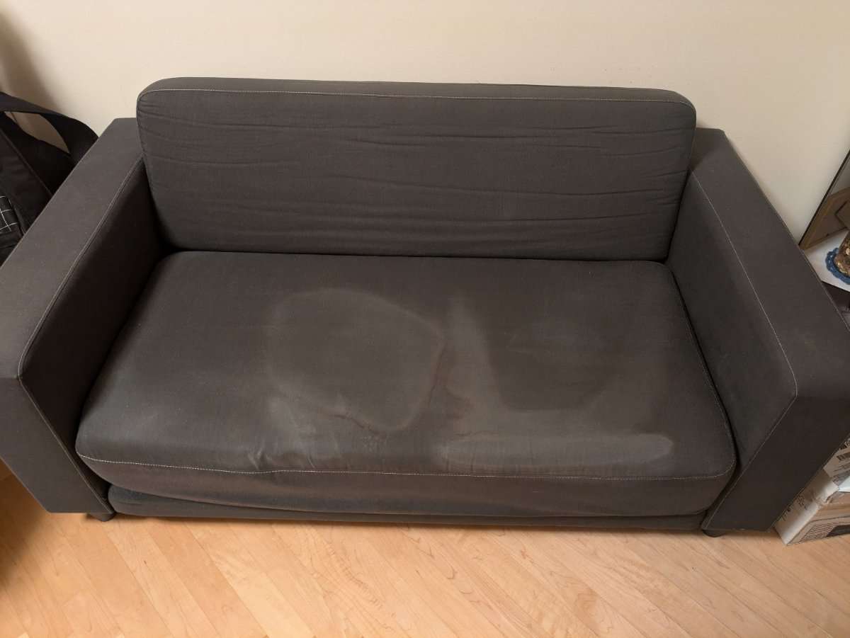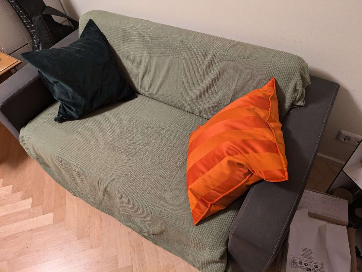Gemütliche Couch zu verschenken! Guter Zustand, nur ein kleiner Fleck durch einen Reinigungsversuch. Mit grünem Überzug auf Wunsch. Pölster nicht inkludiert !