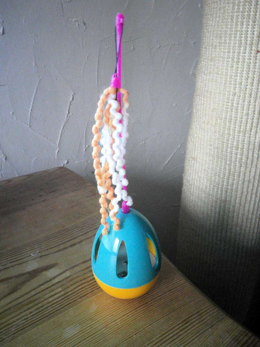 Katzenspielzeug Stehaufmännchen mit Fransen und Glöckchen - ich dachte ich könnte in die Seitensclitze Leckerchen einflen und als Intelligenzspielzeug nutzen, aber die Öffnungen sind zu groß, daher darf das Spielzeug weiter wandern!