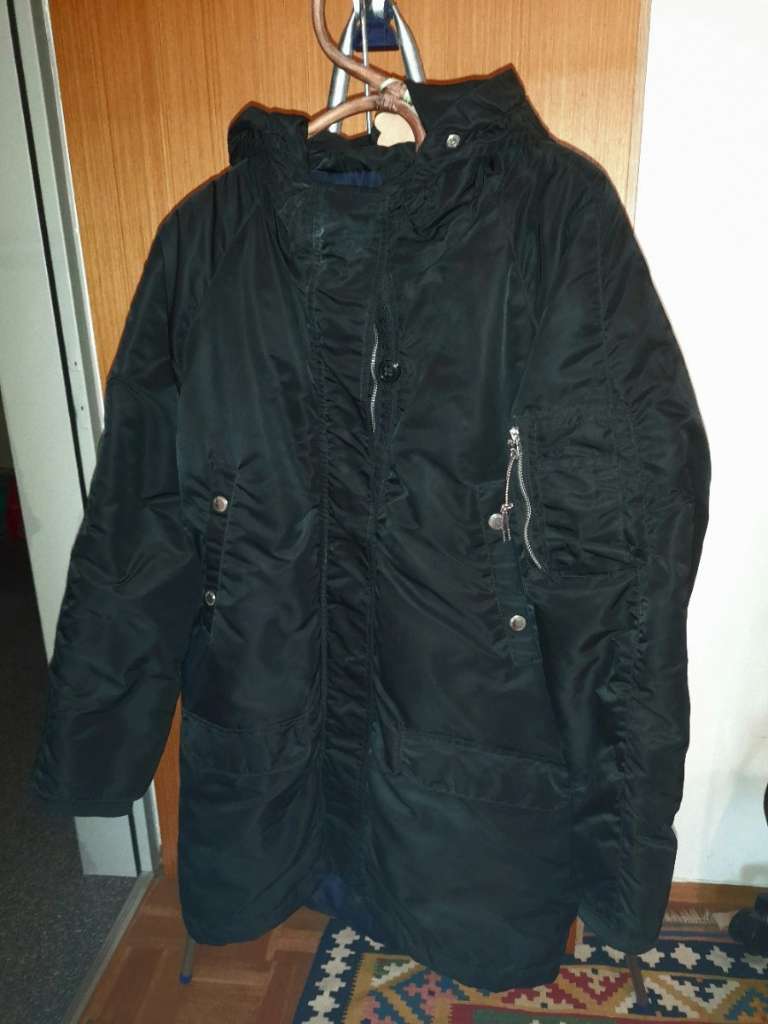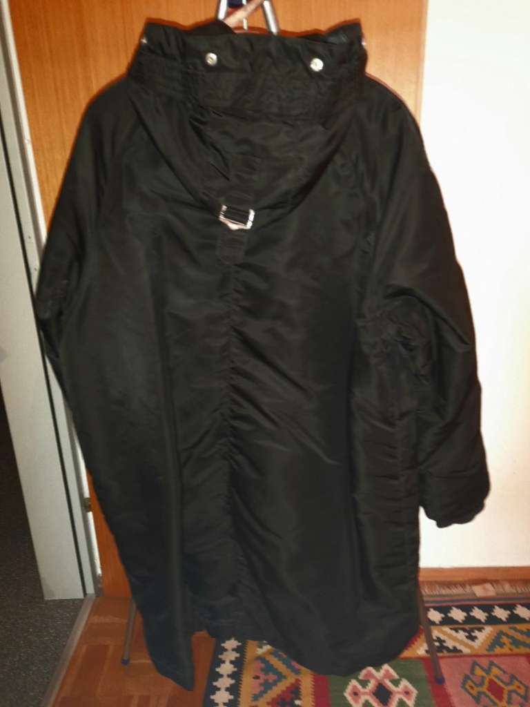 wenig getragen Jacke aus Polyamid, windfest, mit Kapuze, Größe 46 (jedoch klein geschnitten), Rückenlänge 87 cm ab Kapuzenansatz Ärmellänge innen 48 cm, vorne 4 Taschen, am linken Ärmel 1 Tasche und eine Innentaschen...
