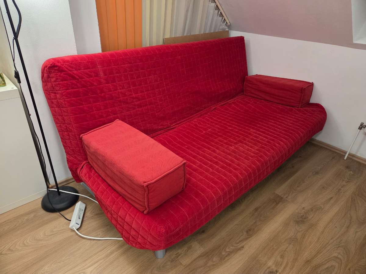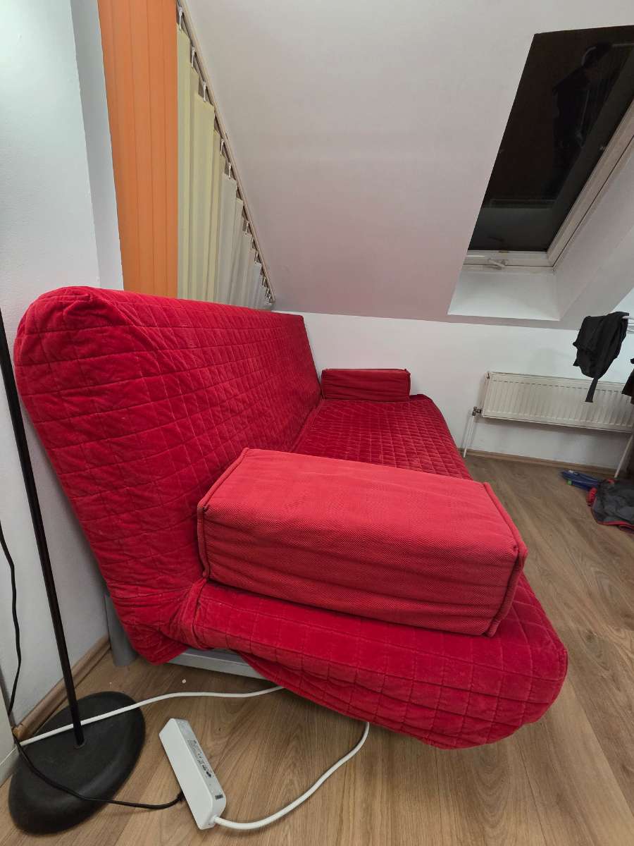 Comfy red sofa with storage underneath that can flatten into a bed. All the textiles can be removed to be washed. 200cm wide, 100cm deep Pick up only. ============== Bequemes rotes Sofa mit Stauraum, das sich in ein Bett verwandeln lässt. Alle Bezüge...