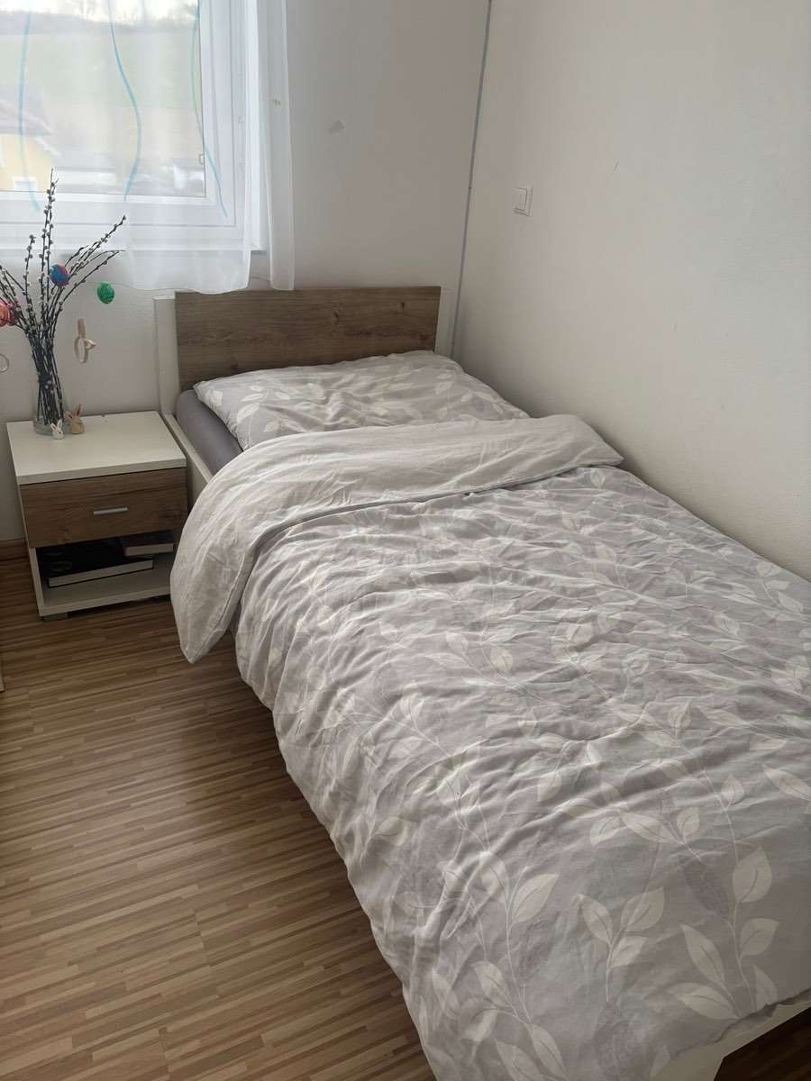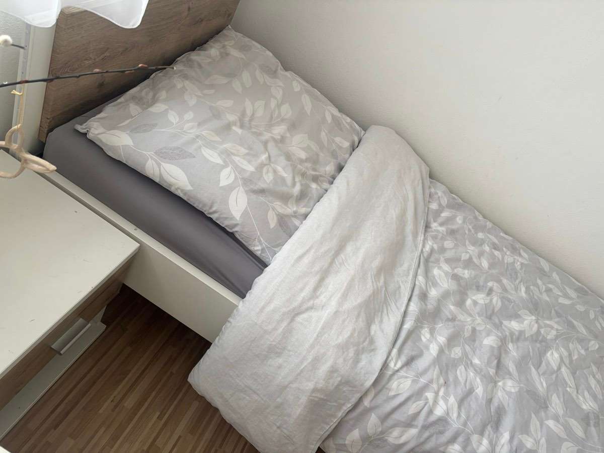Bett 90x200 Inkl. Lattenrost und Matratze (Bezug frisch gewaschen) Inkl. Nachtkästchen Die Fronten in Holzoptik sind geklebte Folien. Darunter wäre die Front rot. Ob die Folie rückstandsfrei abgeht, wissen wir nicht. Weiters sind an einer Seite noch...