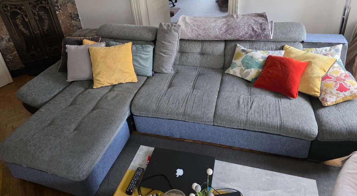Ich verschenke ein L-förmiges Sofas (ohne die abgebildeten Kissen). Abholung ab 15:00 Uhr mit eigenem Transport möglich.