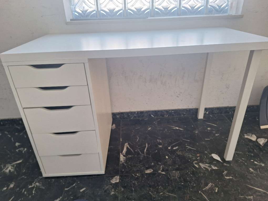 Schreibtisch weiß, Maße 120 cm x 60 cm, zwei Schubladen sind zu reparieren