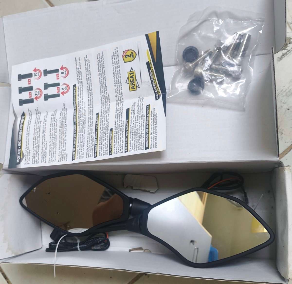 Die Spiegel sind absolut neu. Noch nie montiert worden und original verpackt. Leider ist beim Transport der linke Spiegel gebrochen,wie auf den Bildern zu sehen.