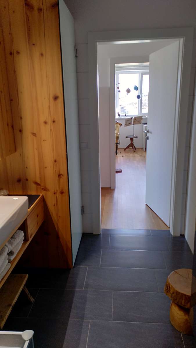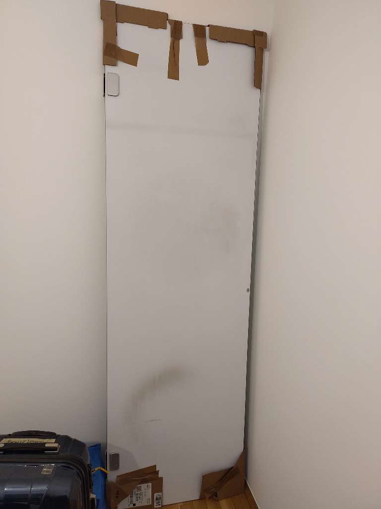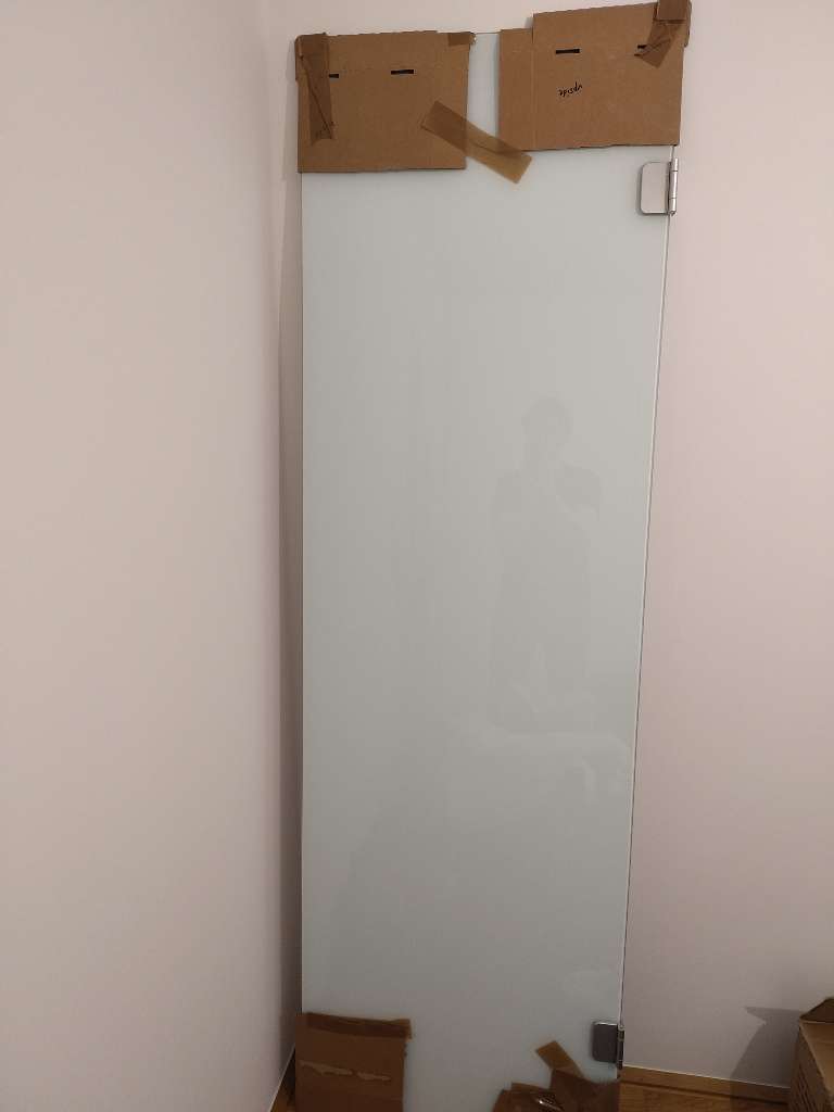 Verschenke Glastür (ESG) in milchig grünem Ton. Maße ca. 220cm x 67cm. Die Tür hat seitlich zwei Anschläge, die mit jeweils zwei Dübel in der Wand befestigt werden. Innen hat die Tür Verfärbungen aufgrund einer Waschmaschine bzw. eines Trockners, die...