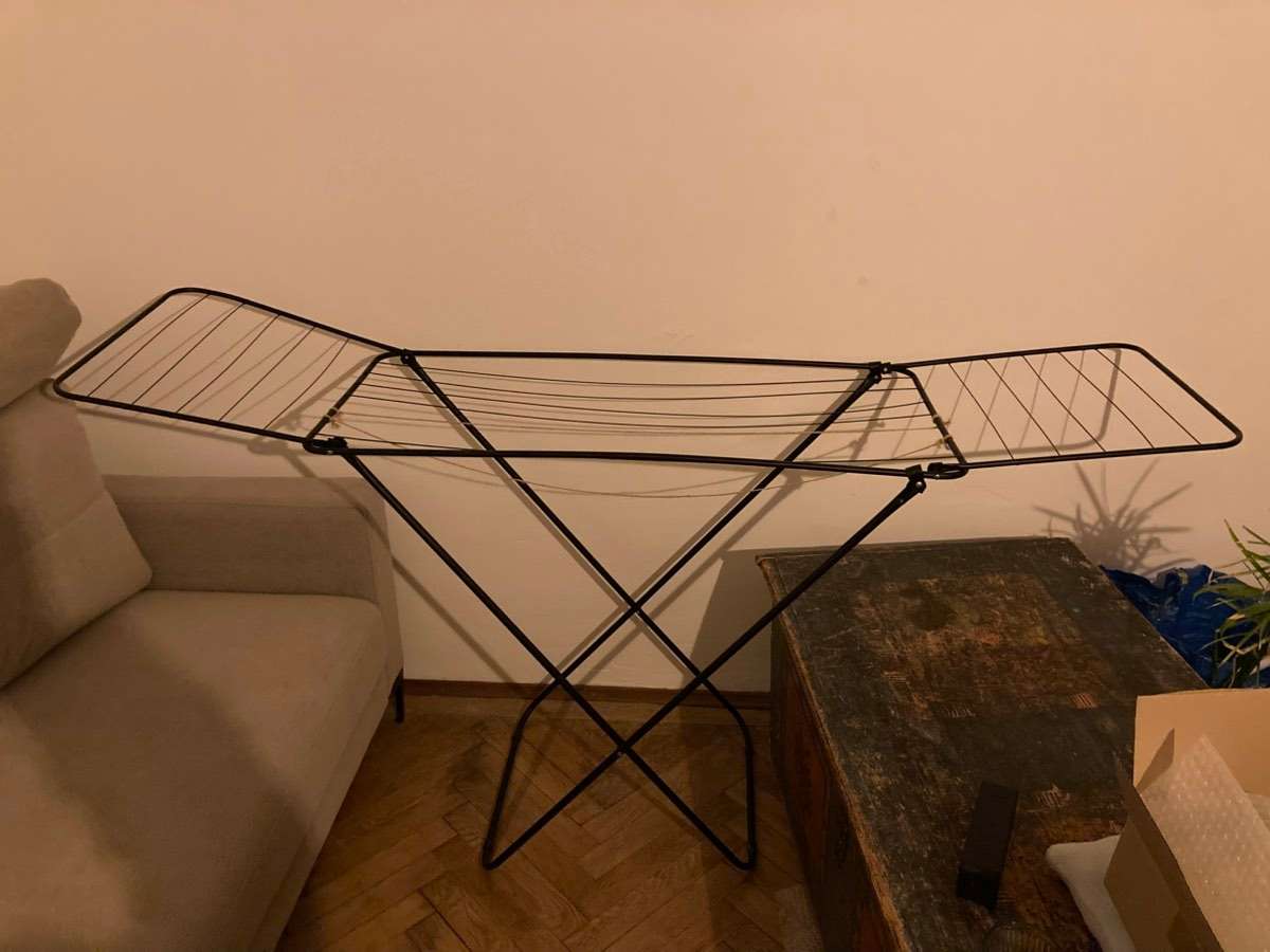 Ein großer stabiler Wäscheständer. Zwei fehlende Stangen wurden mit Schnur ersetzt.