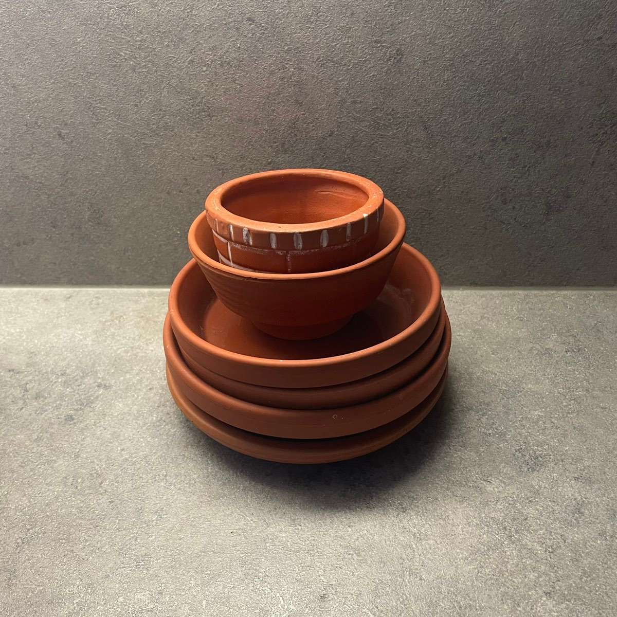 Verschiedene Gefäße / Untersetzer für Pflanzen in Terrakotta