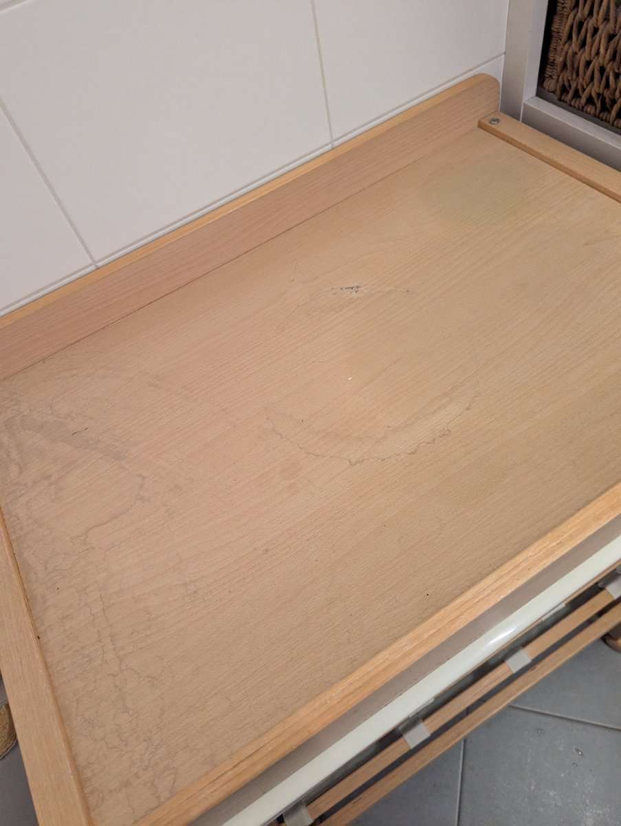 Der Wickeltisch hat uns gute Dienste erwiesen. Verfärbungen/Flecken beeinträchtigen die Funktion nicht. Er ist sonst auch sauber aber hat eben schon Gebrauchsspuren. Mit einer Wickelauflage sind diese jedoch gut verdeckt.