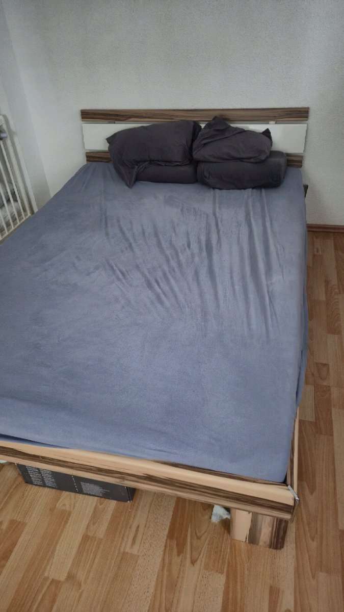 Bett mit Matratze und Lattenrost. Beschädigt.Auf dem Lattenrost fehlt eine Platte. Und ein Bein hält Lattenrost.