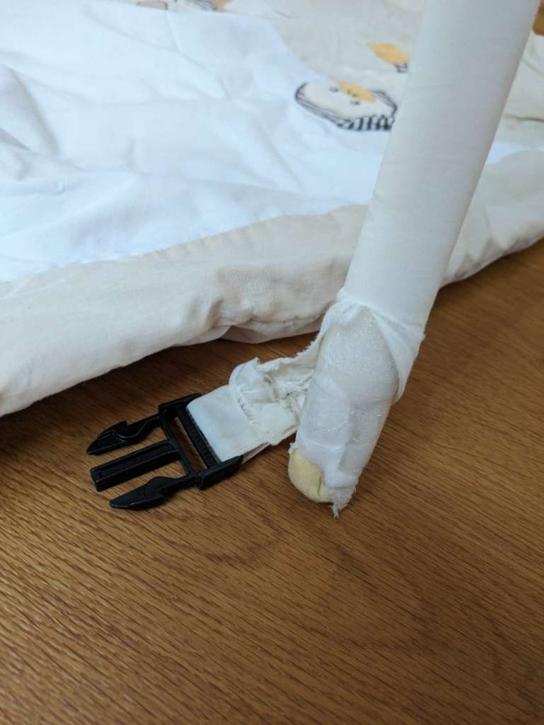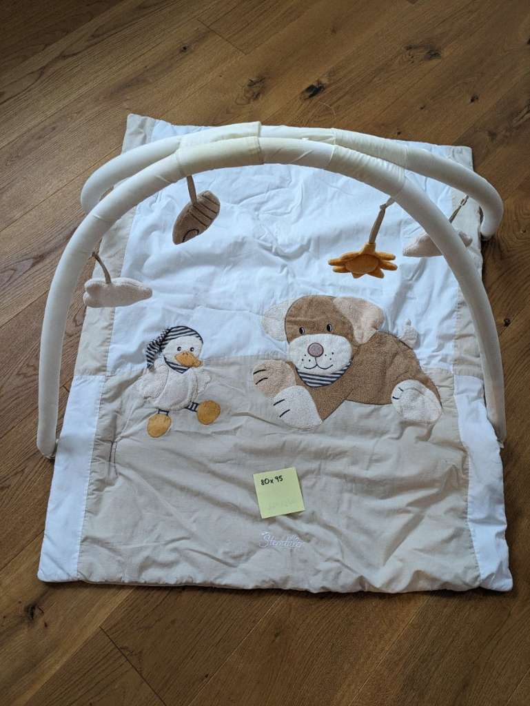 Bogen kann abgenommen werden, um die Decke zu waschen. Leider ist der Stoff an einem Bogen an einer Seite aufgerissen, dies schränkt jedoch nicht die Funktion ein. Spielsachen Anhänger können auch alle abgenommen werden. In der Decke befindet sich ein...