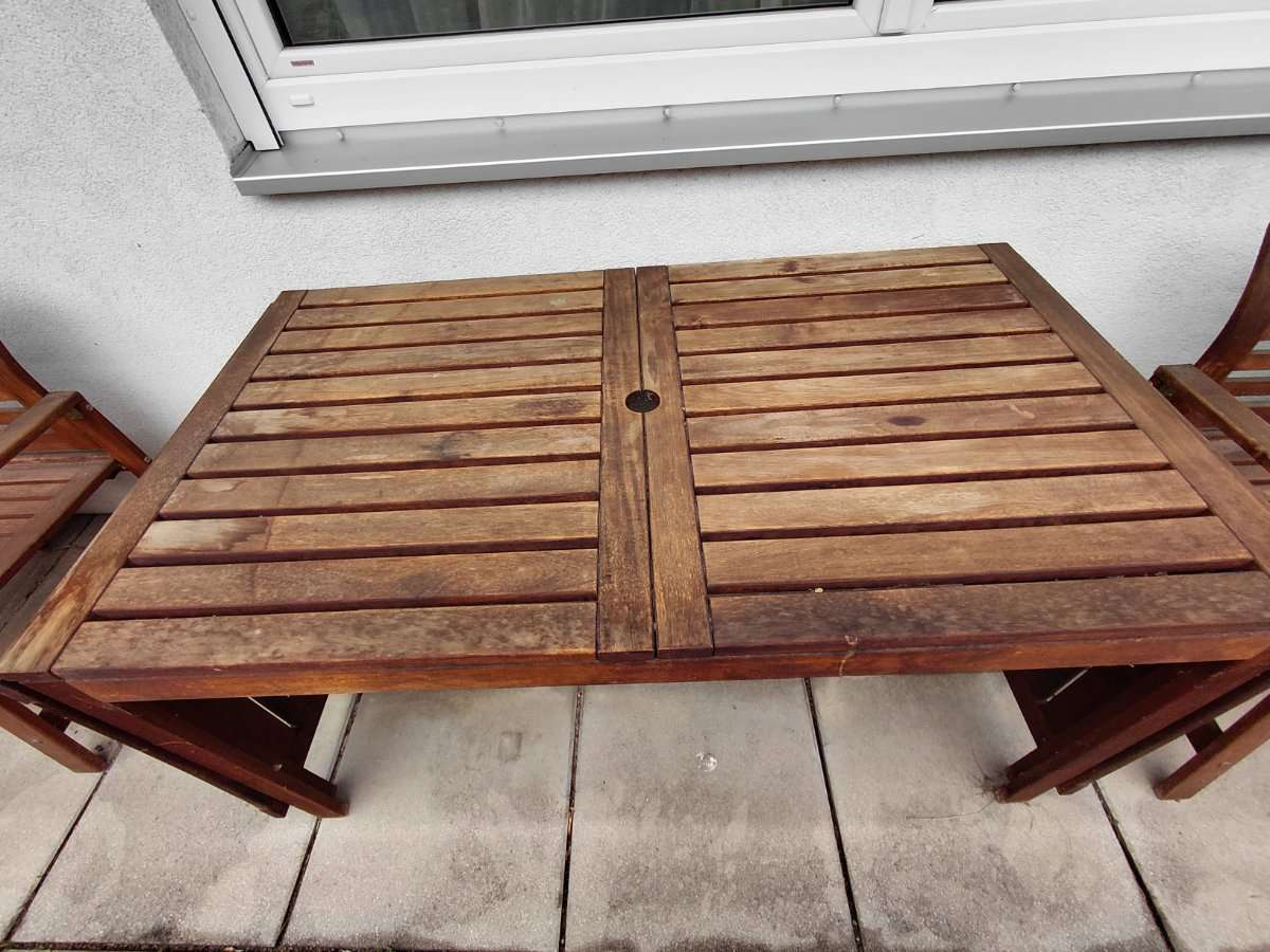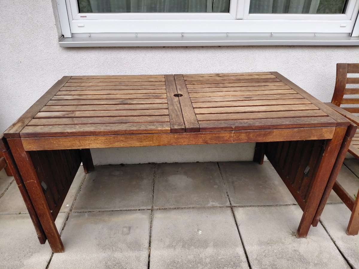 Verschenken Gartentisch aus Akazienholz der Serie "Äpplarö" von Ikea, da er nicht weiter benötigt wird. Maße 78 cm x ca. 150 cm - die Tischfläche ist erweiterbar. Wir verschenken ihn in ungeputztem aber stabilen Zustand wie auf den Fotos ersichtlich. Bei...