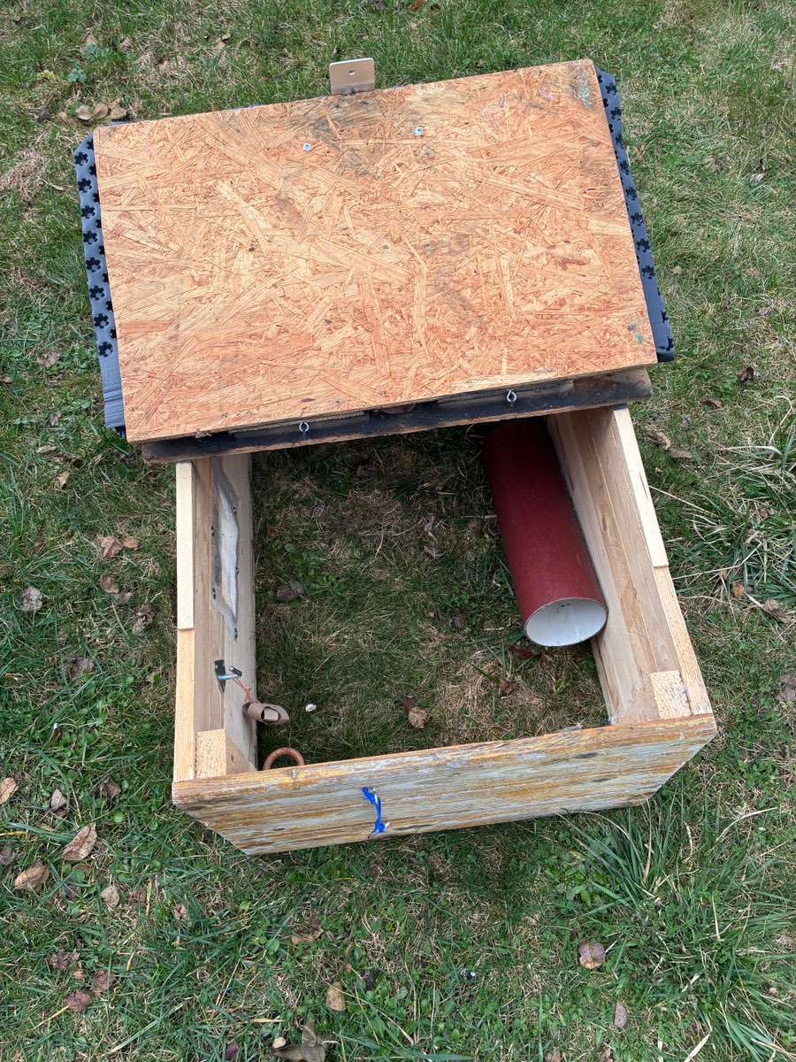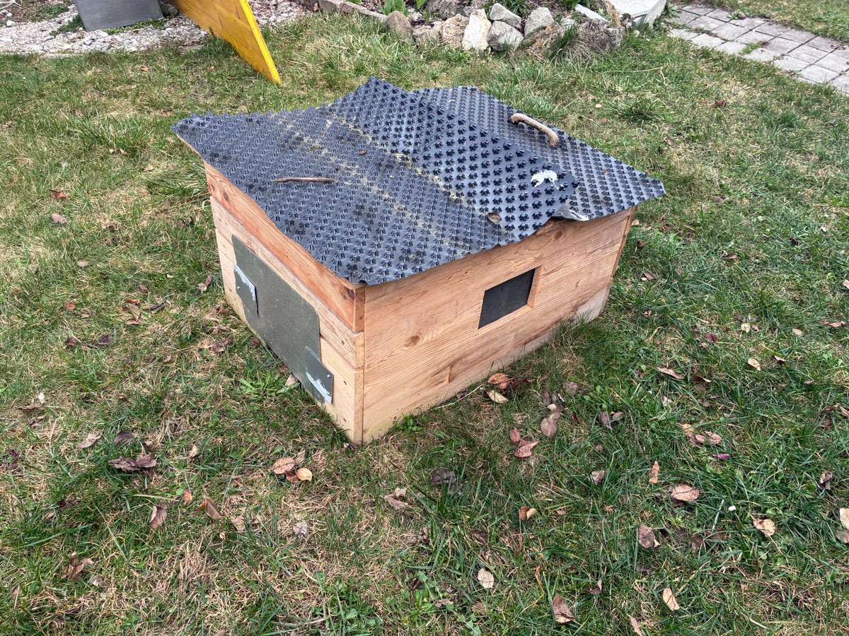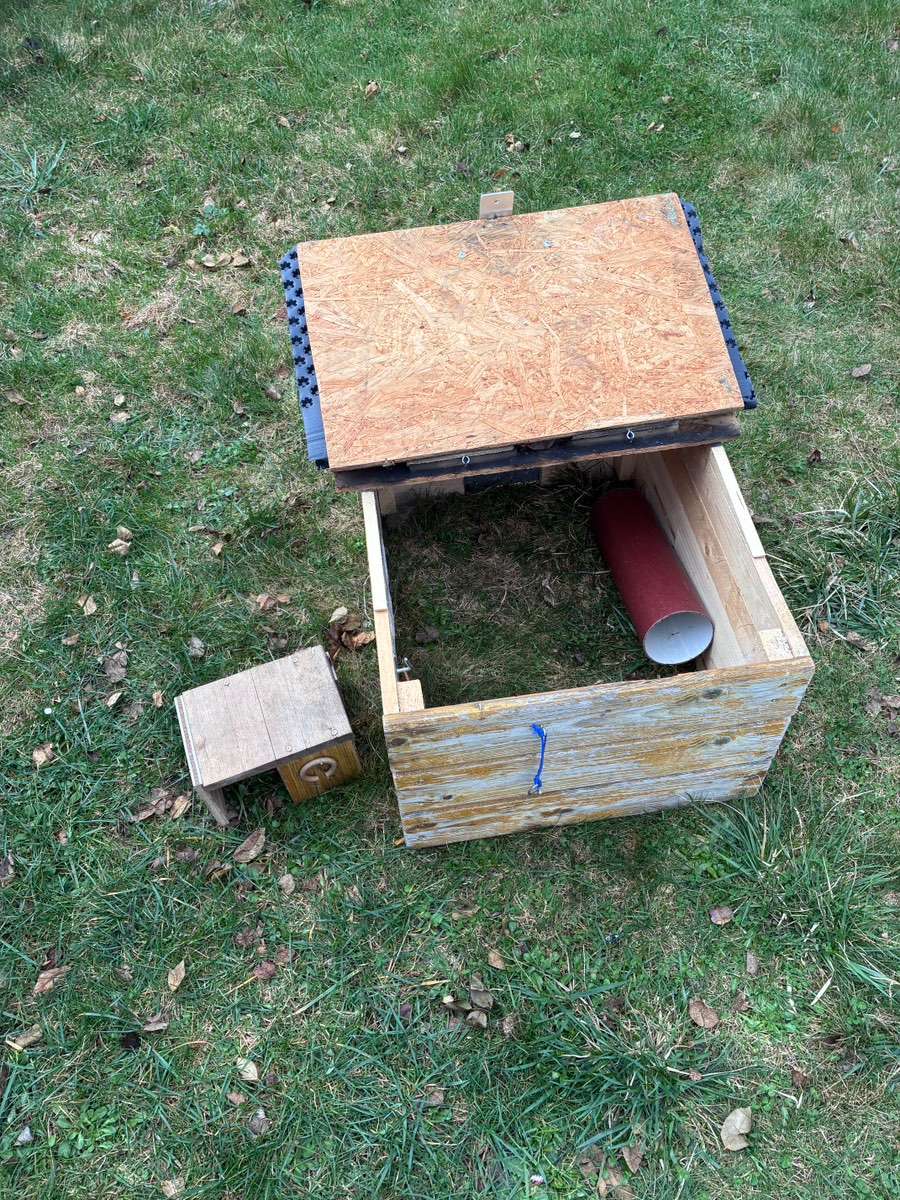 Selbstgebauter kleiner Käfig für kleine Nagetiere - mit kleinem Tunnel - Holzhäuschen und Schubklappe für Auslauf ins Freie