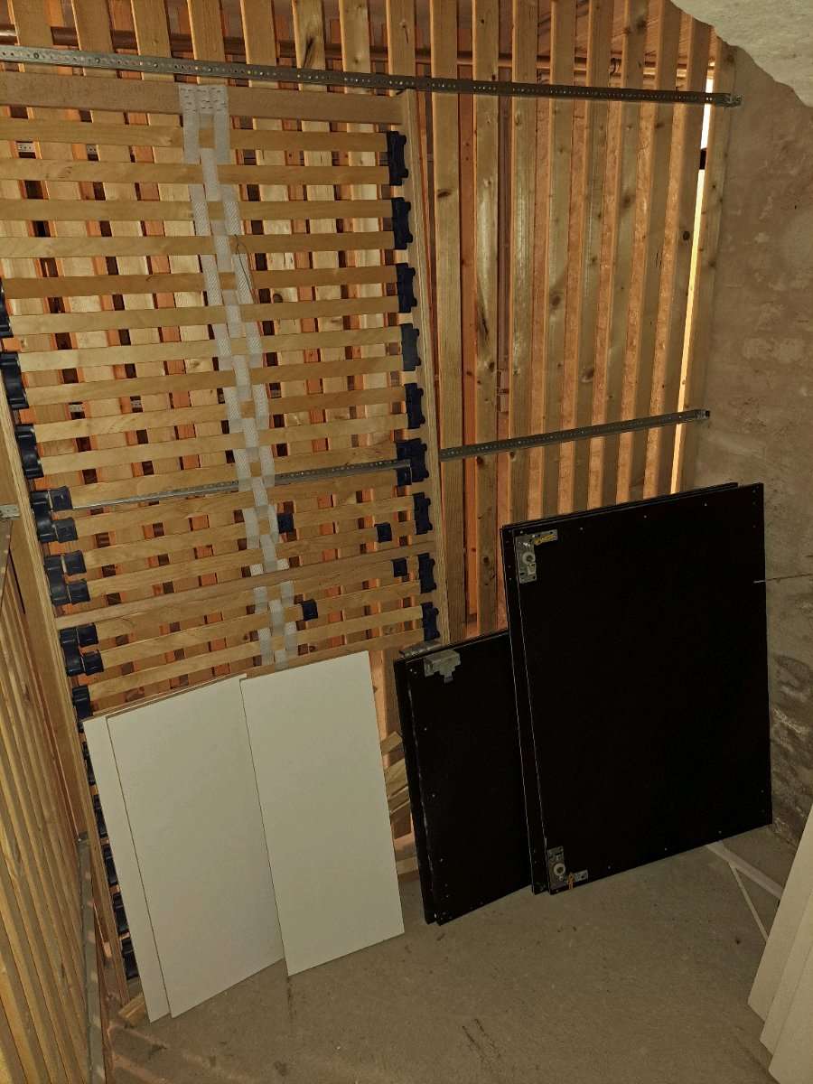 Zu verschenken ist alles, was auf dem Foto zu sehen ist: Kleiderschrank, Lattenrost fürs Bett, Rudergärett...