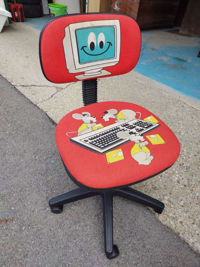 Kinder-Drehstuhl mit Retro-Design Bunter Kinderstuhl mit fröhlichem Motiv: ein lächelnder Computer und kleine Mäuse am Keyboard. Der Stuhl ist höhenverstellbar und hat ein stabiles schwarzes Drehgestell mit Rollen.