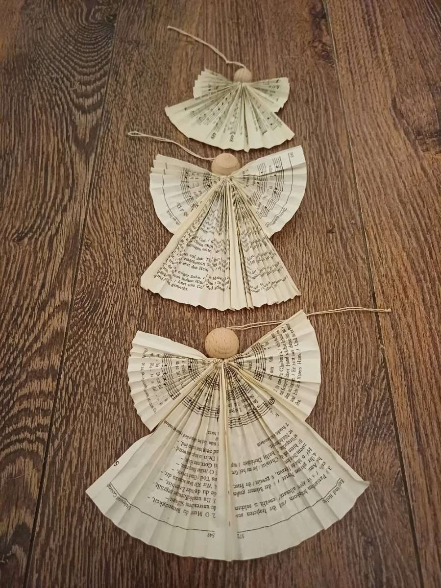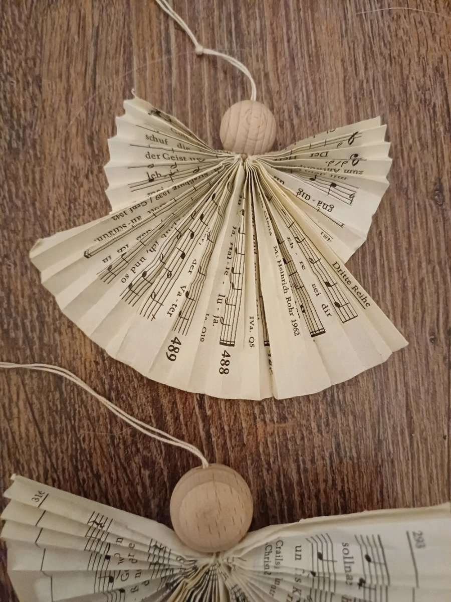 Aus einem Gesangbuch wurden die Körper der Engeln hergestellt, der Kopf ist aus Holz. Mit einem Bindfaden können Sie aufgehängt werden.